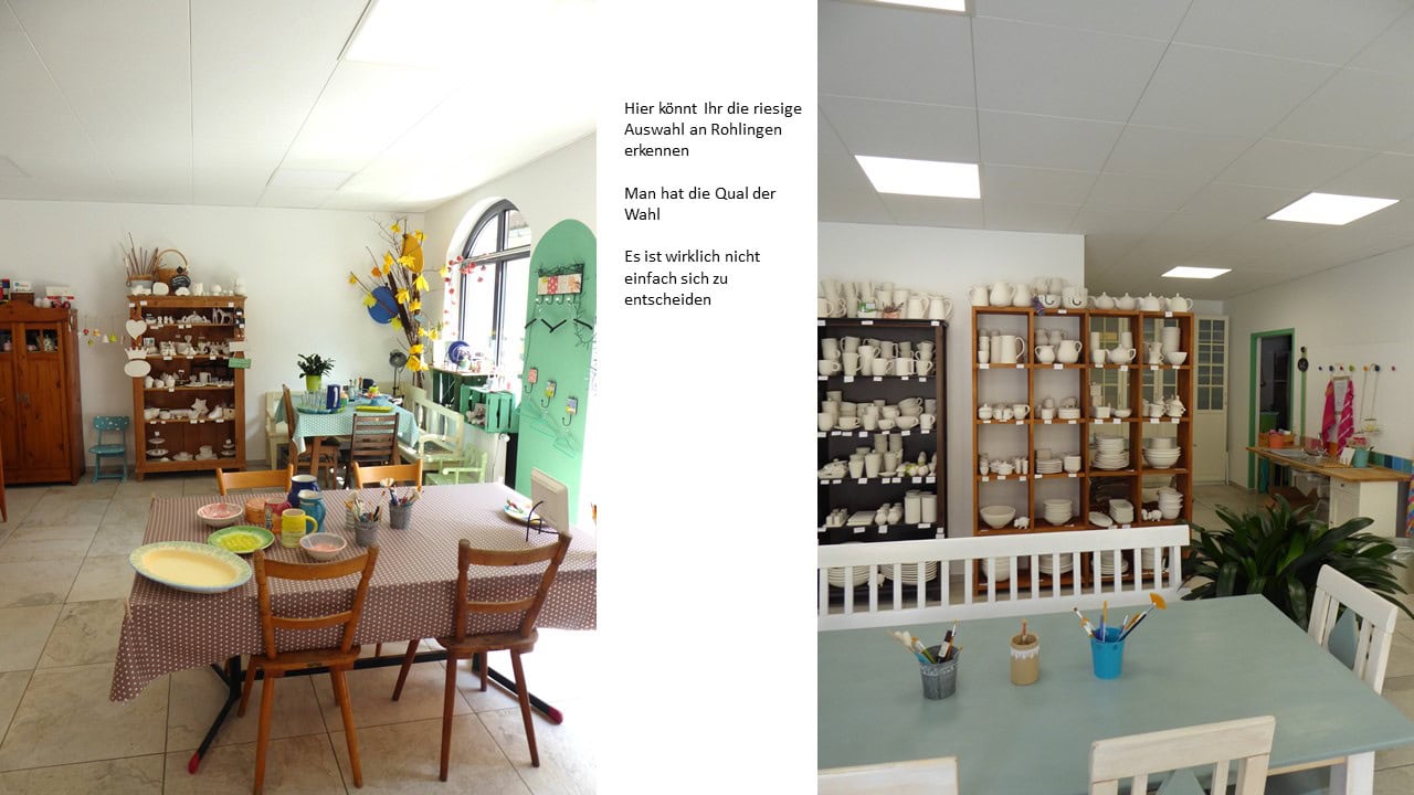 Der Laden liegt am Rand von der Passauer Altstadt. Nachdem die Tiefgarage neben dem Laden liegt, schaut man sich automatisch die Auslage an. Im Laden selber sind Tische an einer sonnigen Fensterfront aufgereiht. Also lässt sich nicht nur in einer sonnigen Atmosphäre das Geschirr bemalen, sondern genießt der angehende Künstler so nebenher auch noch das pulsierende Stadtleben von Passau.