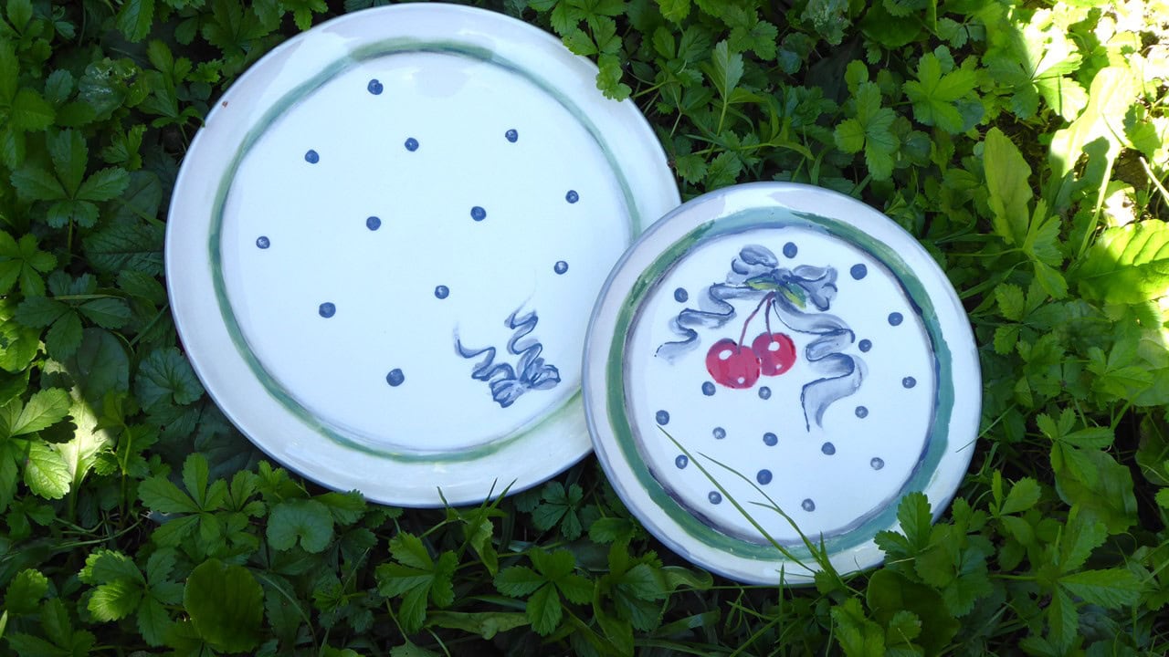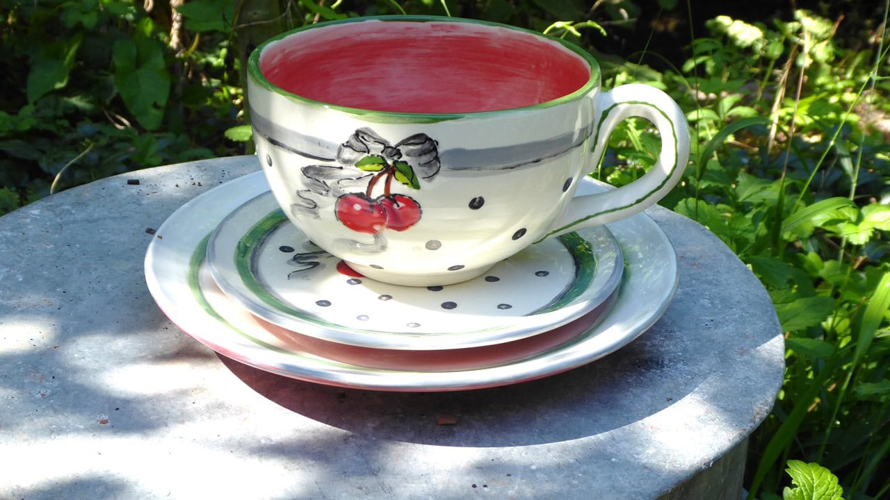 Das Bemalen ist relativ einfach, es stehen Schablonen zur Verfügung, Stempel, eine großzügige Auswahl an Farben samt Pinsel und nötigem Zubehör und auch die Möglichkeit die Tassen und Teller „Freihand“ zu bemalen, so wie ich. Ich persönlich liebe es aufwendig mit vielen Details zu malen, das geht leider nicht so gut. Die Farbe zeigt einem schnell die Grenzen auf. Trotzdem bin ich mit meinen Kirschen sehr zufrieden. Beim nächsten mal werde ich mich allerdings mit Rändern und Kleinigkeiten begnügen. Die Farbe selber macht nicht wirklich Spaß um detailgenau zu malen. Schön ist das Geschirr trotzdem geworden.