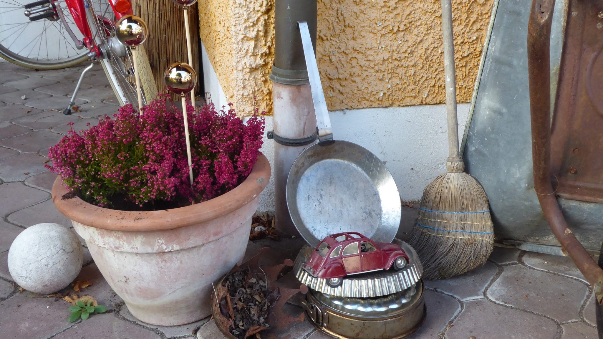 Nebenher findet sich auch so manches für den Garten, alte Emailtöpfe, Blecheimer, Zinkeimer, altes Glas für Mosaik, wunderschöne Glasflaschen, so dass hier in unserem Garten schon manches Stück aus dem Recyclinghof zu uns den Weg gefunden hat und zu einem neuen Dasein berufen wurde.