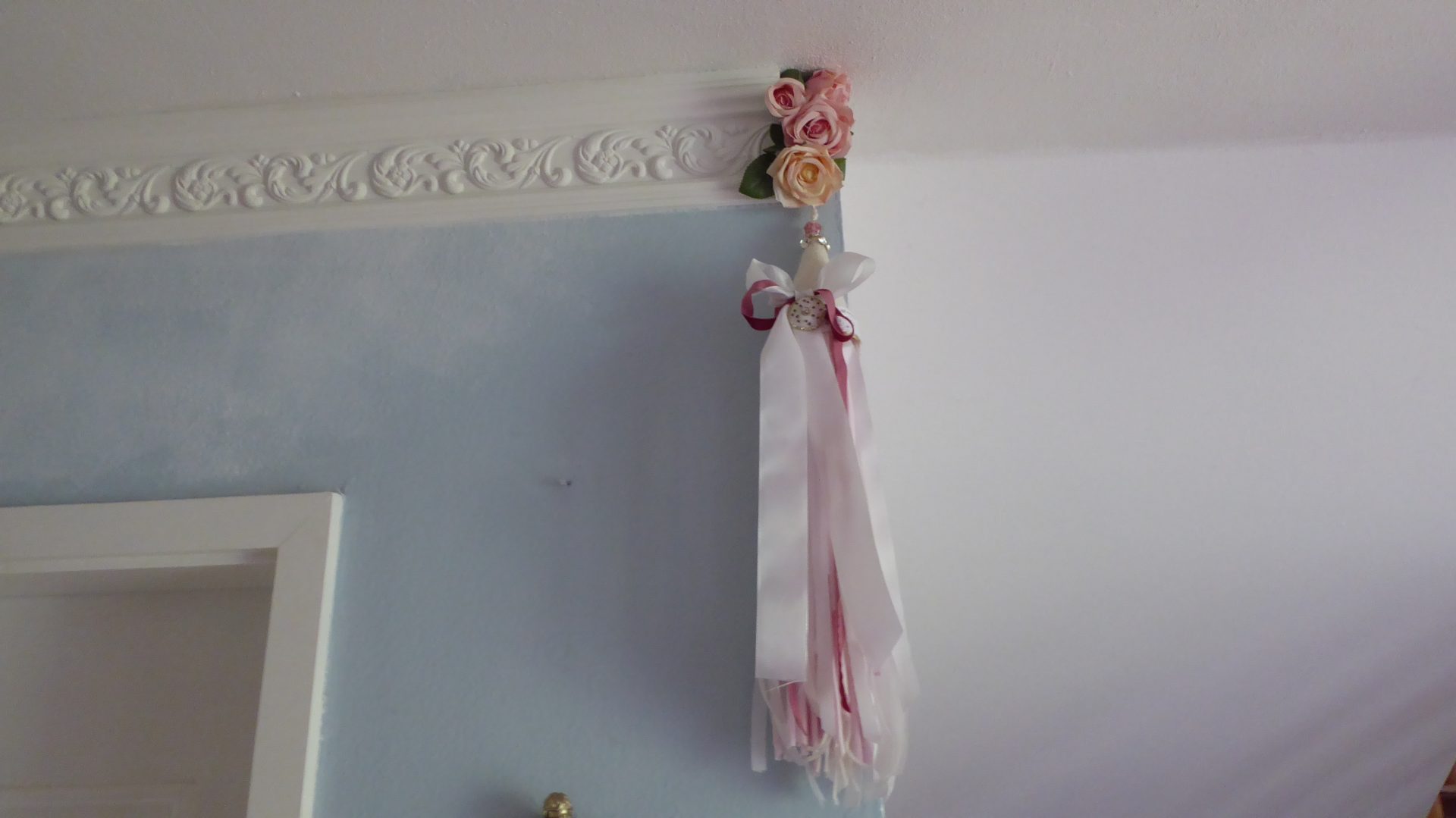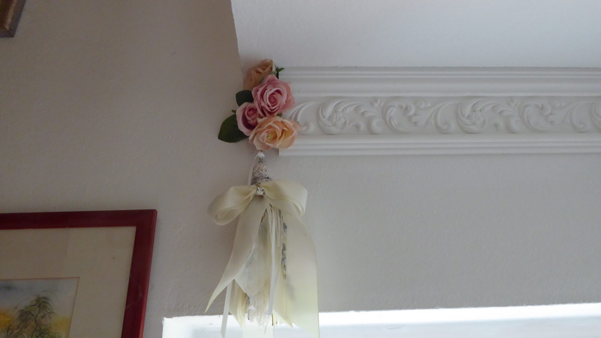 Als Abschluss für die Stuckleisten haben wir diese Quasten angefertigt und mit Seidenrosen verziert. Beim nächsten Mal werden wir die Rosen aus Pappmasche anfertigen und weiss streichen, so dass diese an Stuck erinnern. Aber mangels Zeit haben wir uns hier für die einfachere Variante entschieden.