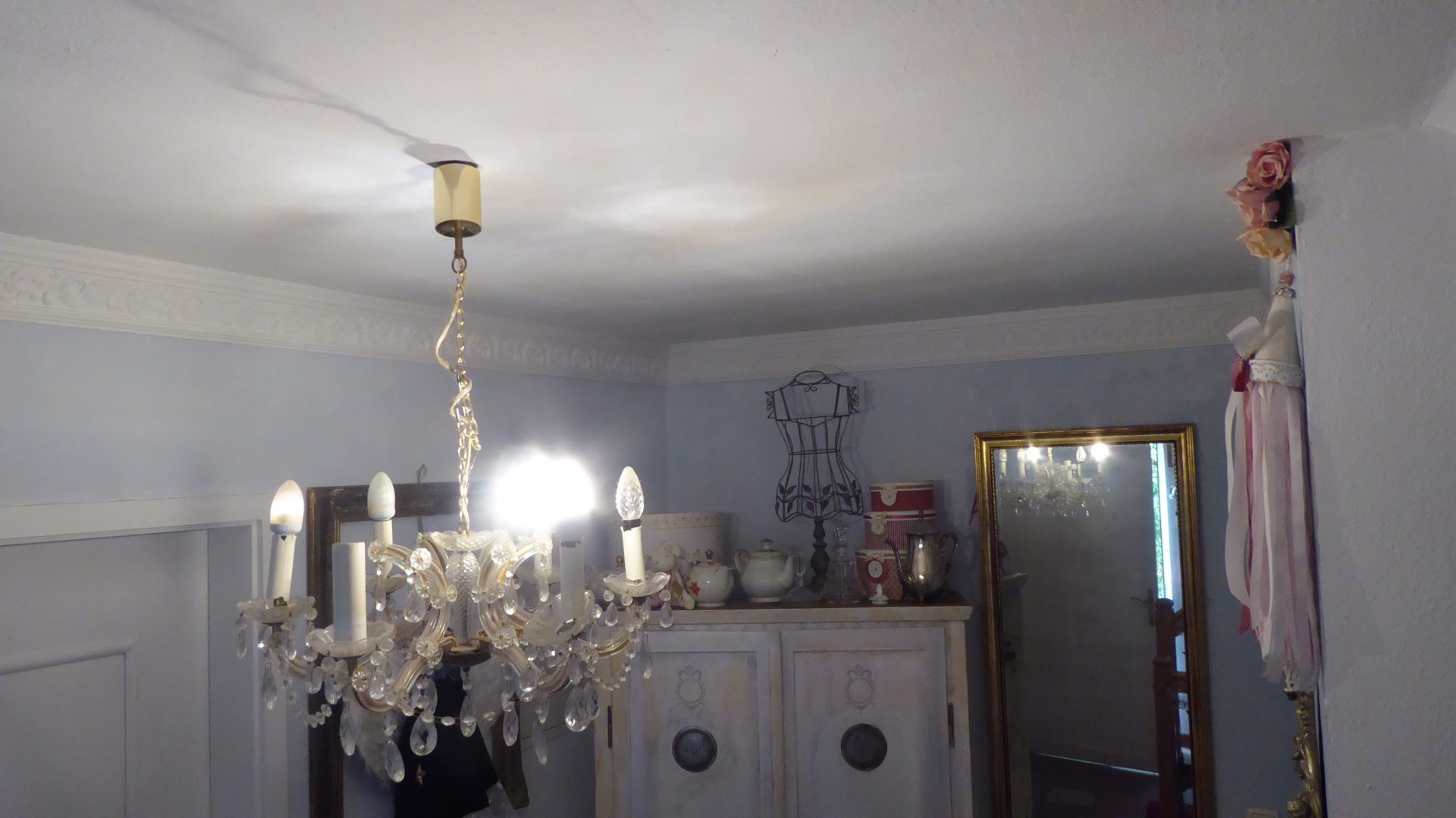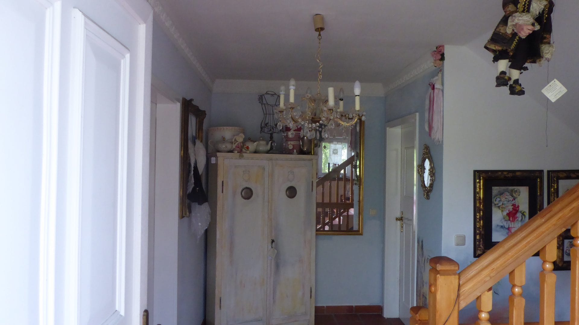Alte Karaffen aus Kristallglas, Hutschachteln und ein bisschen altes Gekruschel tun ihr übriges, um den Gang im schönen Schabby- Chic-Look erstrahlen zu lassen. Natürlich dürfen auch Stuckleisten unter der Decke nicht fehlen. Auch der Leuchter ist aus einem Flohmarkt-Fundus.