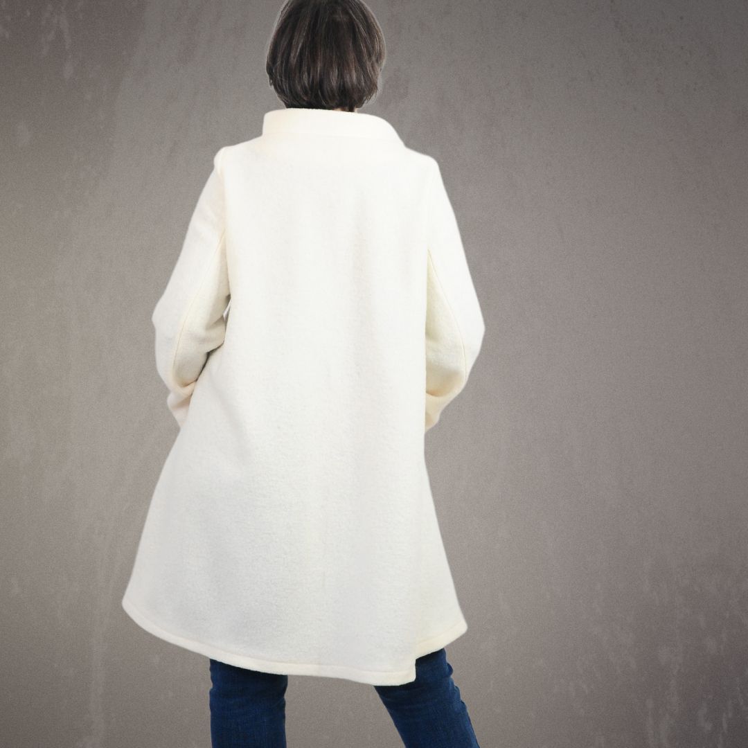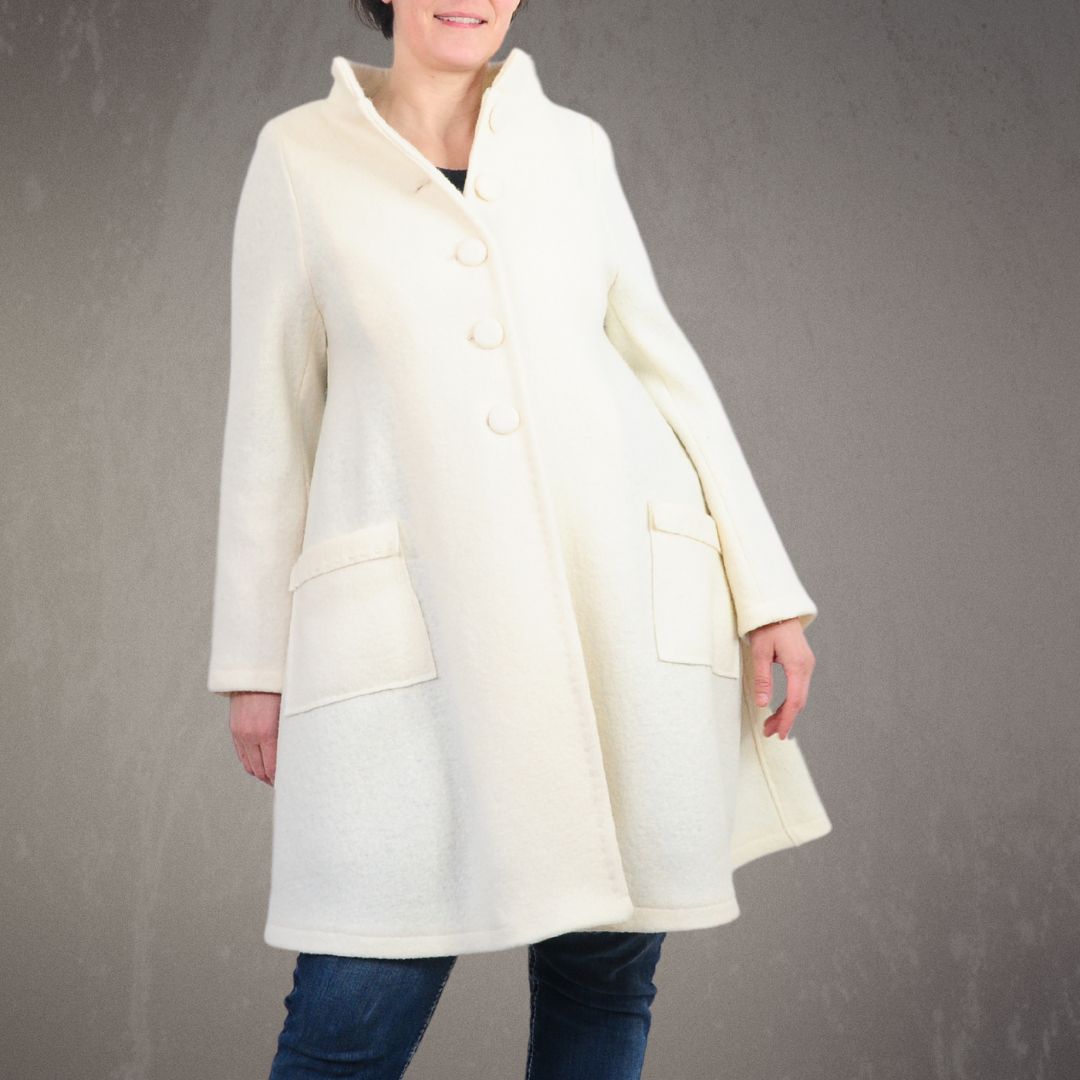 Der >>Swingermantel lebt von seiner glockigen Form, die sich ausgezeichnet zu engen Röcken oder auch Hosen kombinieren lässt. Wir haben den Mantel einmal in einer Länge unter dem Knie genäht, alternativ eine handbreit über dem Knie. Der Mantel verfügt über zweiteilig geschnittene Ärmel, die besonders angenehm zu tragen sind.