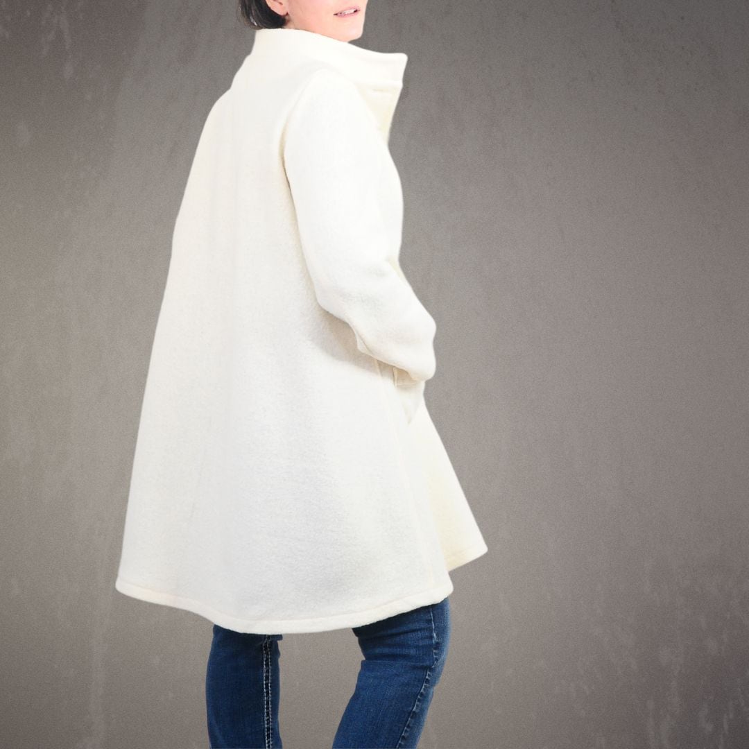 Der >>Swingermantel Candice ist ein tolles Projekt für Nähanfänger/innen. Er ist einfach geschnitten, hat keine besonders schwierigen Nähparts und Du kannst diesen Mantel aus Walk nähen, der kleinere Nähfehler verzeiht.