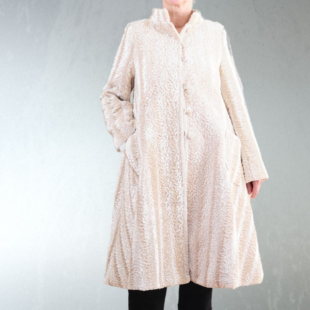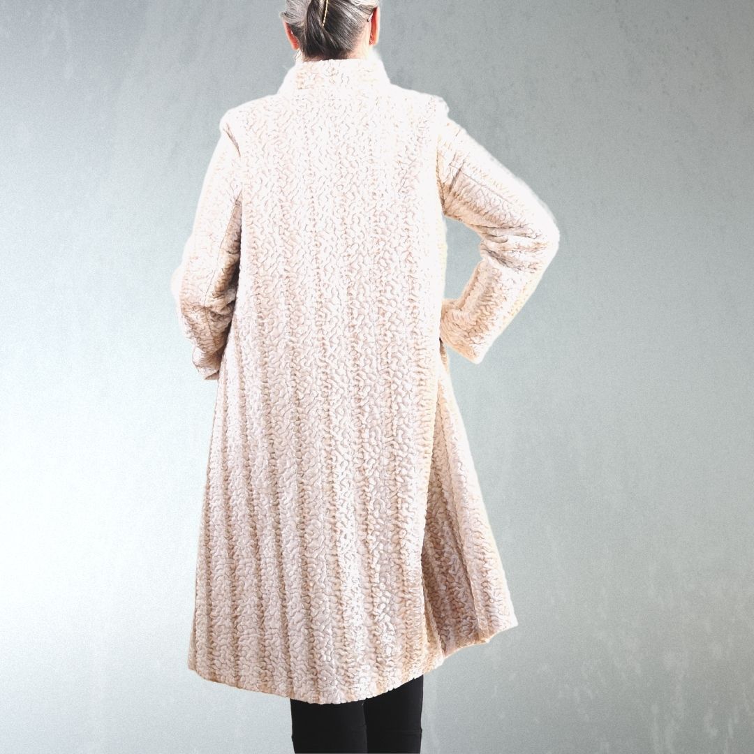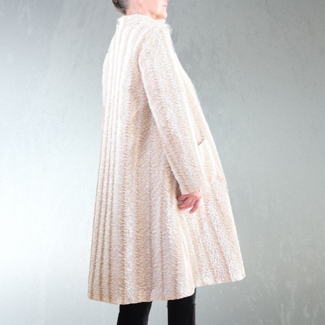 Desweiteren gibt es von diesem Mantel eine zweites Modell, in dem der Mantel abgefüttert werden kann. Hier solltest Du sehr gute Nähkenntnisse auf fortgeschrittener Ebene besitzen. Dieser Mantel wurde aus Kunstpelz genäht und mit einem Futter versehen. Der Mantel ist etwas länger, unterhalb des Knies.