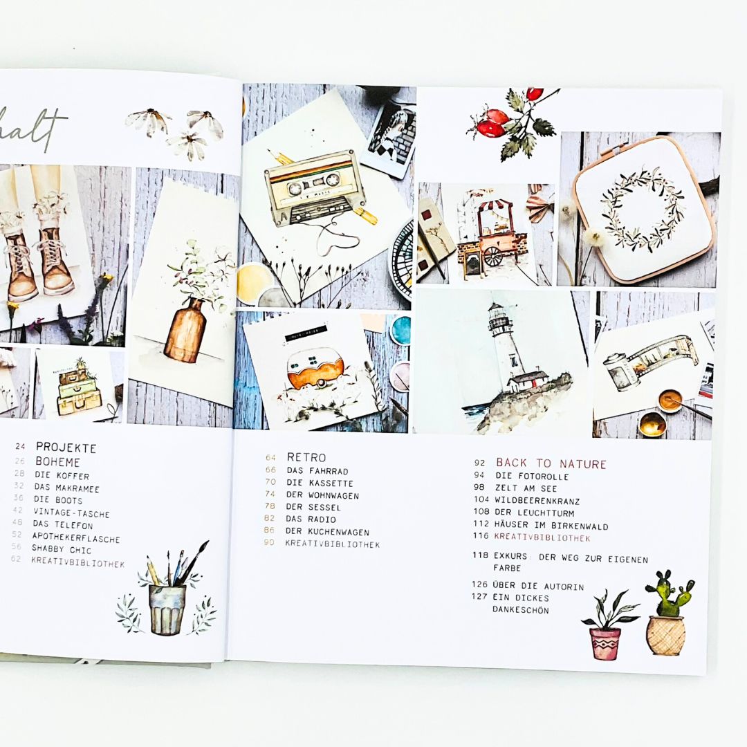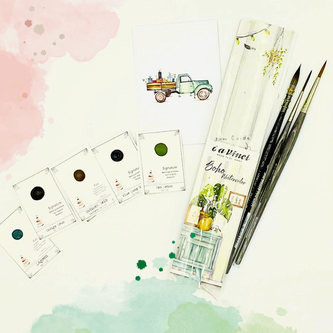 Das Buch enthält sogar Vorlagen, die man entweder abpausen oder als Skizze auf Papier übertragen kann. Es wurde von Madelaine Zülke, auch bekannt als Frau von Bommel, geschrieben. Sie betreibt einen eigenen Onlineshop, in dem nicht nur Farben erhältlich sind, sondern auch Onlinekurse gebucht werden können. Die Kurse sind erschwinglich und ich habe einen davon ausprobiert. Die Videos sind wirklich großartig und Frau Zülke zeigt detailliert, wie man bestimmte Motive malt und welche Pinsel dafür verwendet werden. Was ich besonders toll finde, ist, dass man passend zu den Projekten in ihren Onlinekursen kleine Probefarben kaufen kann. So hat man die Möglichkeit, die Aquarellmalerei auszuprobieren, ohne gleich in einen teuren Farbkasten investieren zu müssen. Ich habe übrigens den Kurs mit den Bäumchen absolviert, und es hat mir sehr gut gefallen. Die Farben und Pinsel sind sehr liebevoll und aufwendig in blaues Seidenpapier und bedruckten Tütchen verpackt. Es bereitet große Freude das Päckchen zu öffnen und die Schätze zu entdecken.
