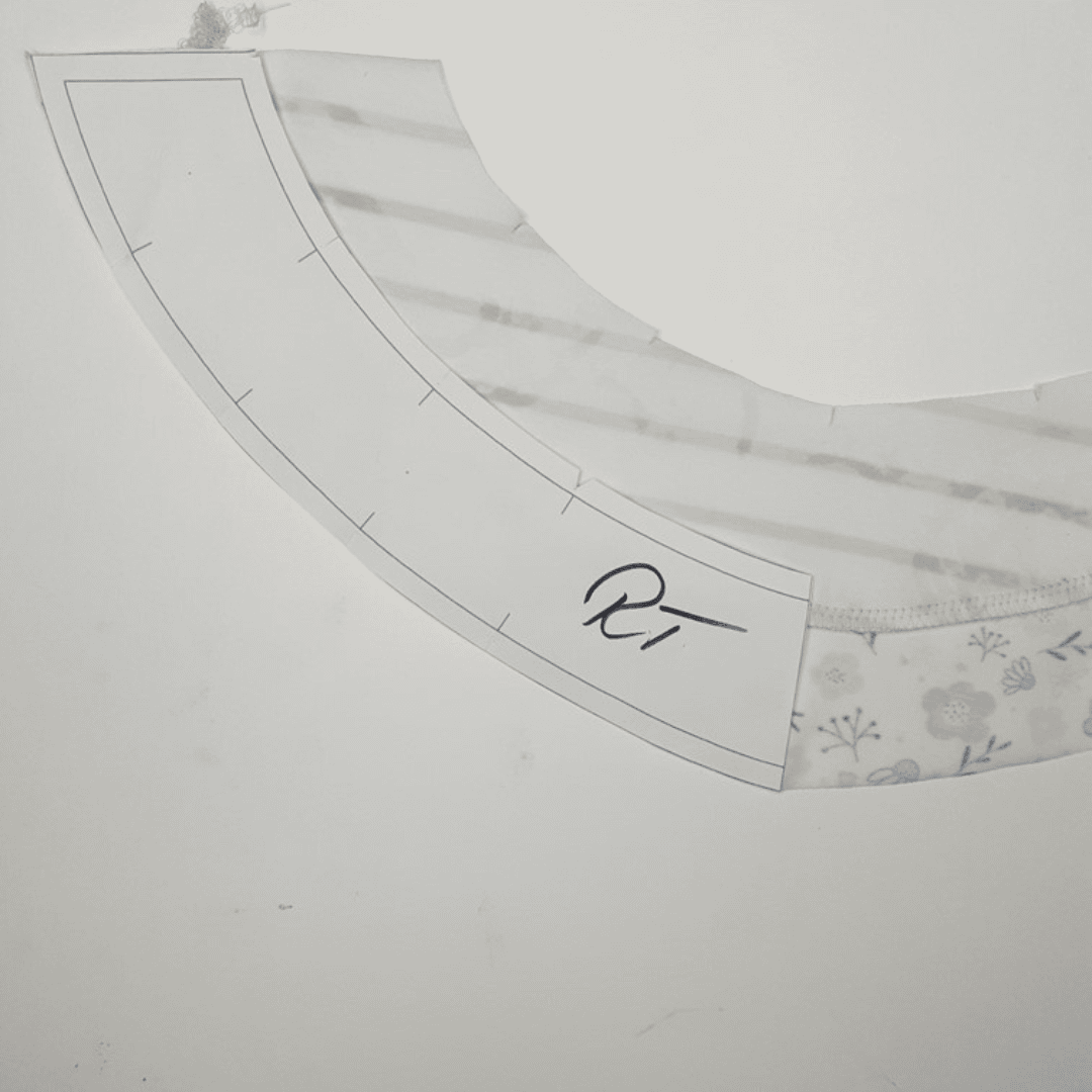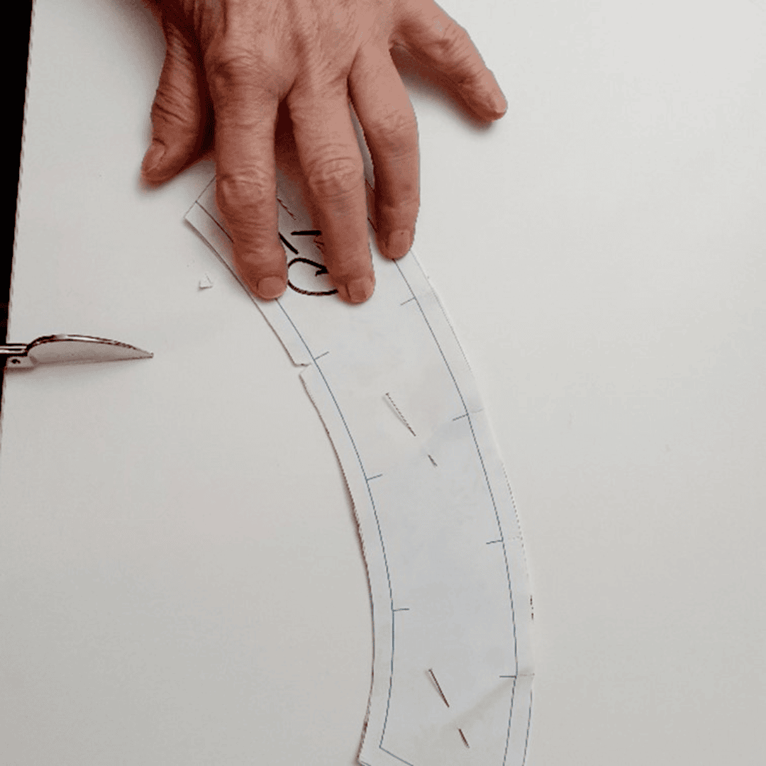 Wir haben den Papierschnitt nochmals auf das fertig genähte Stück gelegt, Du kannst sehen, dass sich der Stoff nicht verzogen hat – die Passen (Bögen) liegen flach auf dem Tisch auf – keine Buckel oder Wellen