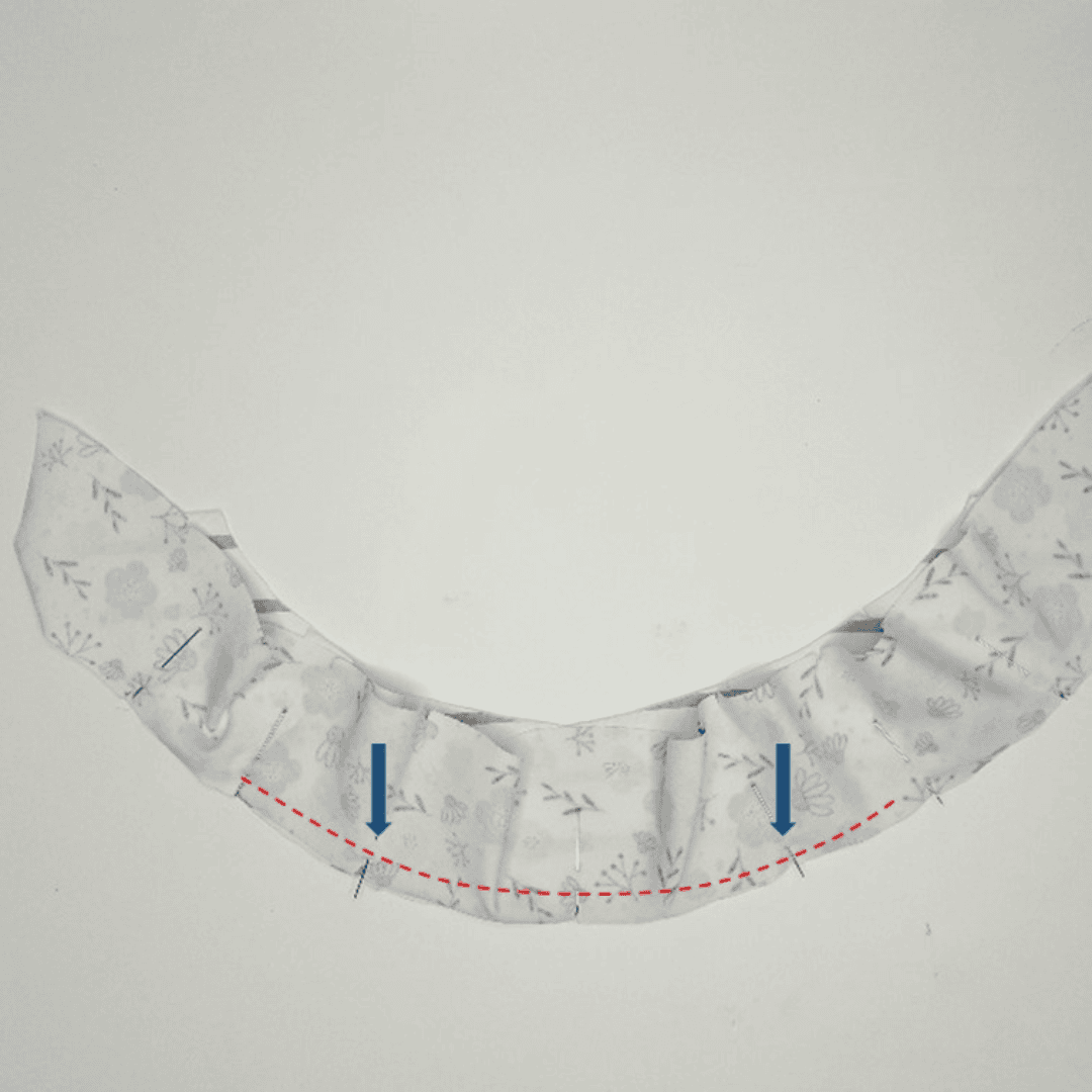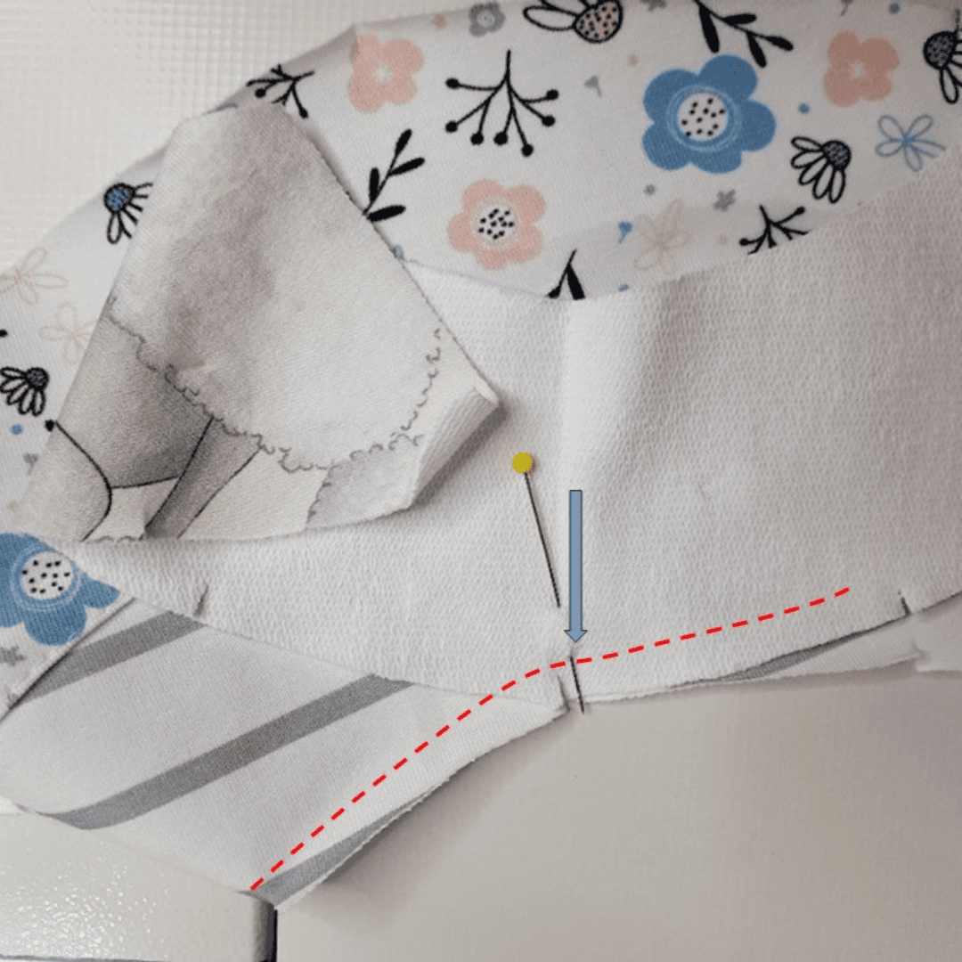 Hier liegt der kleine, also kurze Bogen, oben und der große Bogen (mit mehr Stoff) unten – wenn man den Bogen nun feststeckt (siehe rot gestrichelte Linie), dann dehnst Du ihn automatisch aus.