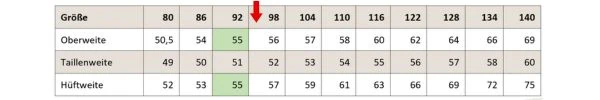 - Brust/Hüfte: 55 cm → Größe 92 lt. Maßtabelle