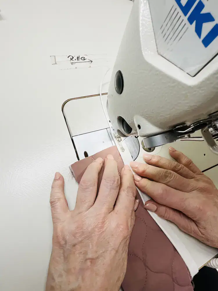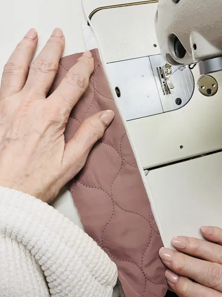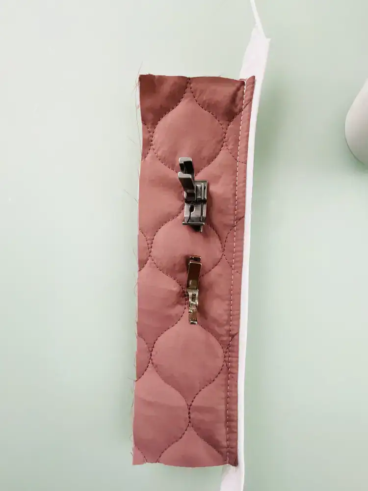7. Danach nochmals knappkantig von rechts absteppen – damit die Naht gerade wird, kannst du den >>Kantennähfuß verwenden.