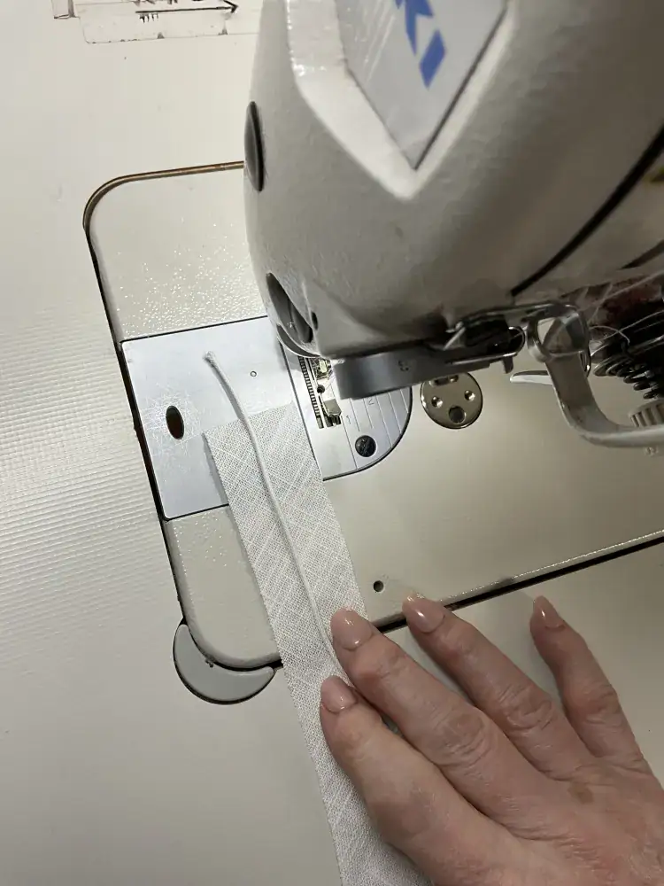 1. Reißverschlussfuß in die Nähmaschine einspannen. Paspelschnur in die Mitte des Schrägbandes legen.