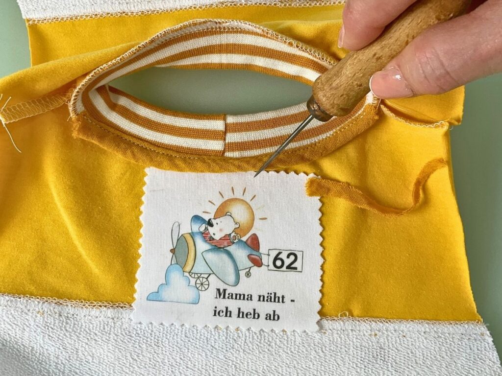 Wir lieben übrigens Labels und haben passend zu den Stoffen Labels drucken lassen. Es handelt sich hier um DTF Drucke, die wunderschön aussehen und sehr haltbar sind. Es ist doch ein wirklich netter Hingucker, wenn im Rücken so ein Label zu sehen ist. Es sollte aufgebügelt werden bevor du die Teile zusammennähst.