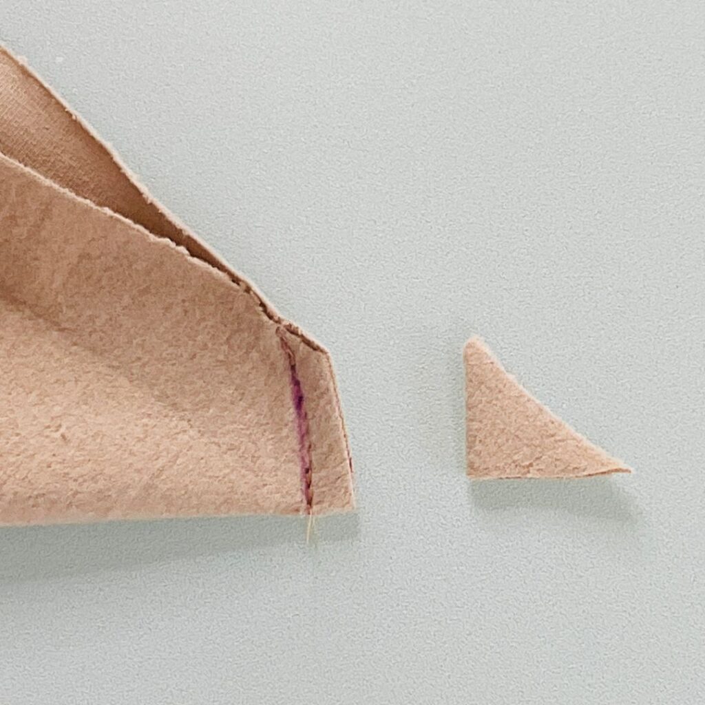 Ecke bis auf eine Nahtzugabe von 0,5cm zurückschneiden. Tasche auf rechts wenden