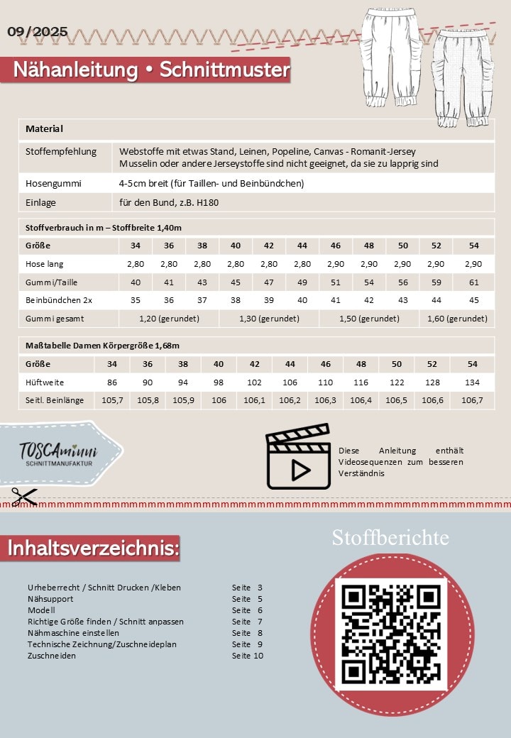 - Stoffempfehlung: Festere Webstoffe wie Leinen, Cord, Canvas – Romanit-Jersey geht auch