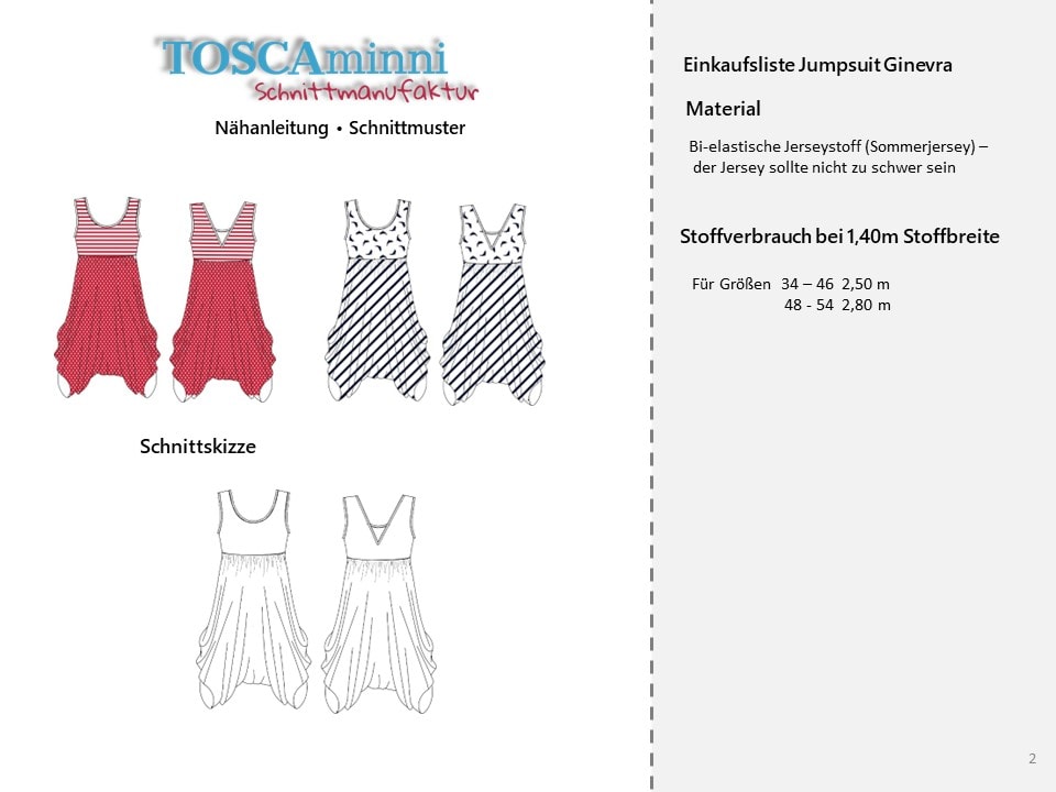 Mit dem Schnittmuster „Ginevra“ ist ein bequemer, luftiger Jumpsuit, der fast wie ein Kleid wirkt. Der Jumpsuit ist einfach zu nähen. Durch das angebauschte Rockteil und das Empireoberteil sieht er für jede Figur gefällig aus. Das perfekte Bade- oder Gartenkleid für heiße Tage. Das Hosenteil ist raffiniert geschnitten und daher auch interessant anzusehen.