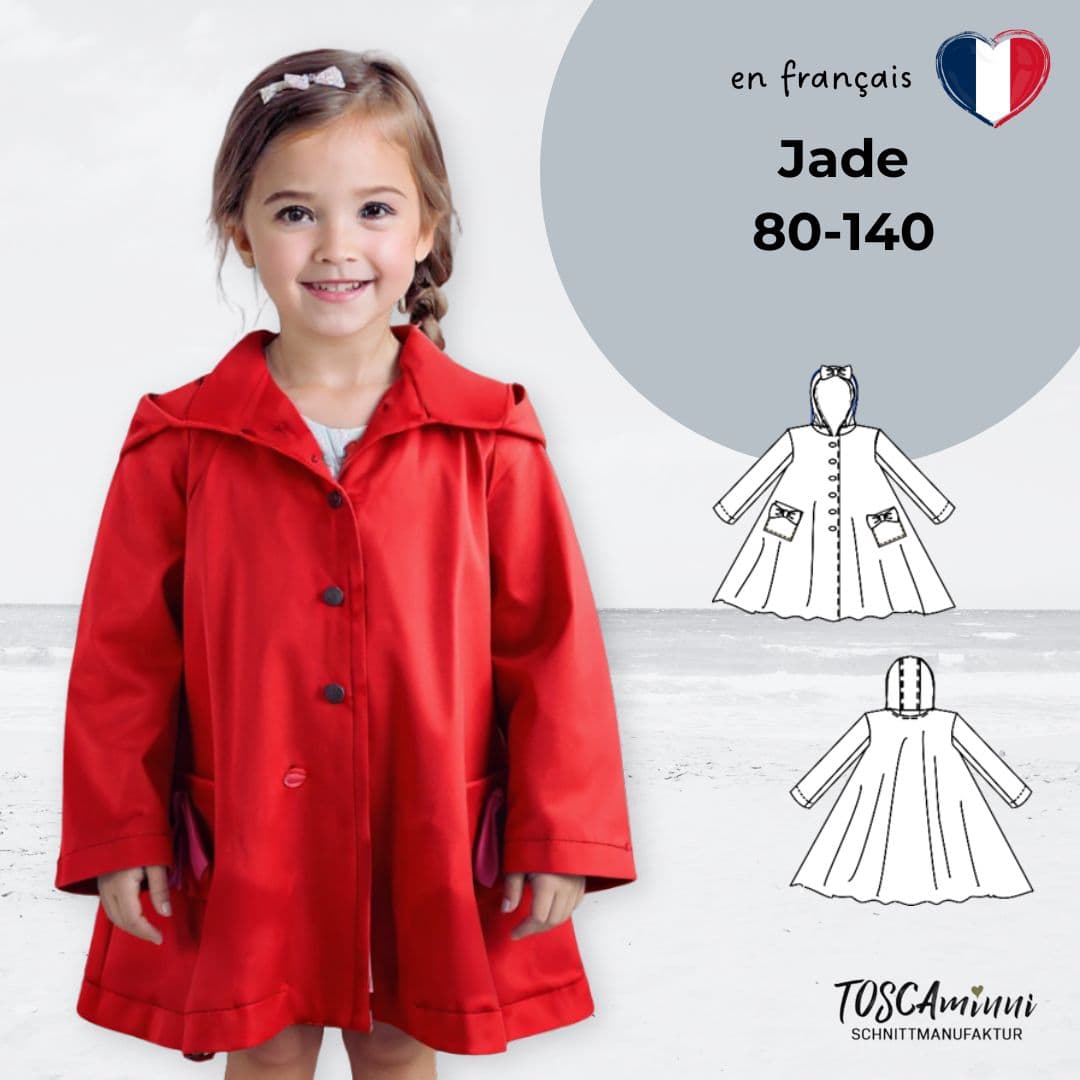 Le patron Jade te permet de réaliser un magnifique manteau pour enfant avec un col montant ou une capuche. Le manteau n’est pas doublé, mais cousu avec des bordures.