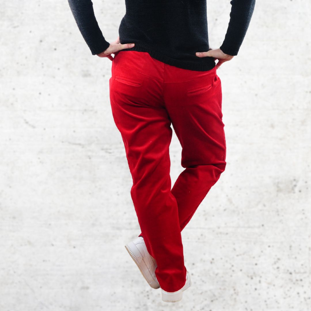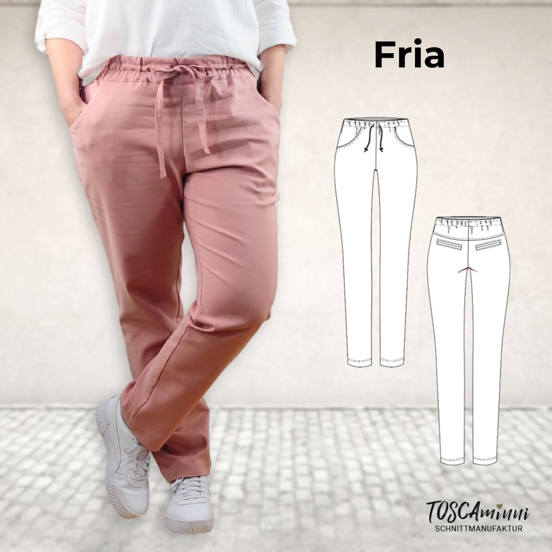 Mit dem Schnittmuster Fria nähst Du Dir eine coole Chino-Hose, die Dich das ganze Jahr begleiten kann. Der Bund ist mit einem Gummizug gearbeitet – zudem ist eine Kordel oder Bindeband zum Regulieren der Weite eingearbeitet.