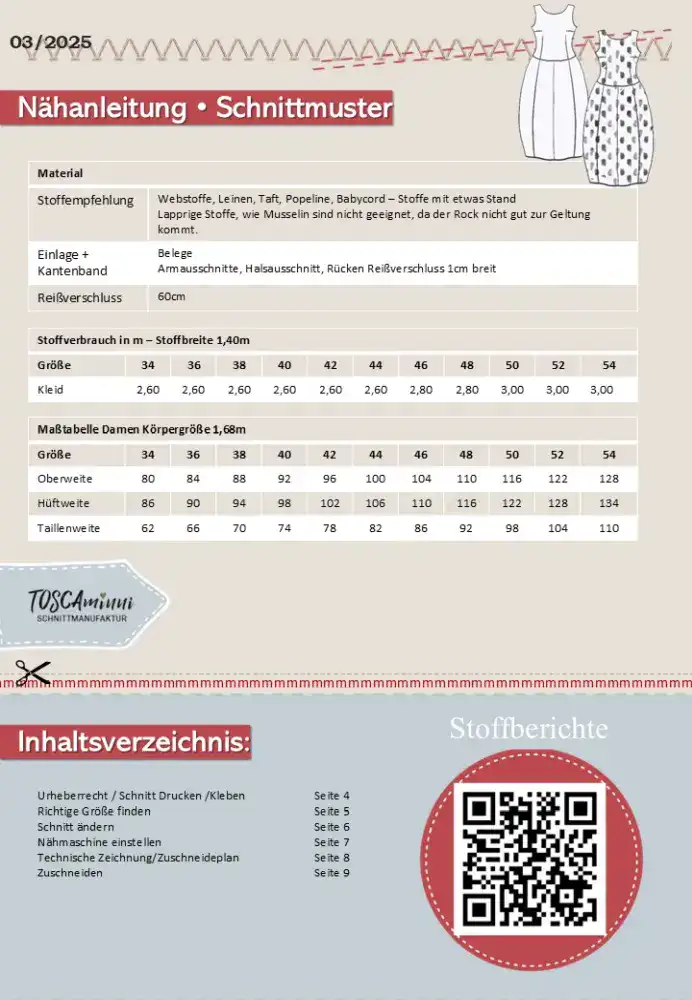- Stoffempfehlung: Webware, z.B. Leinen, Popeline, Baumwollsatin, Stoffe mit etwas Stand