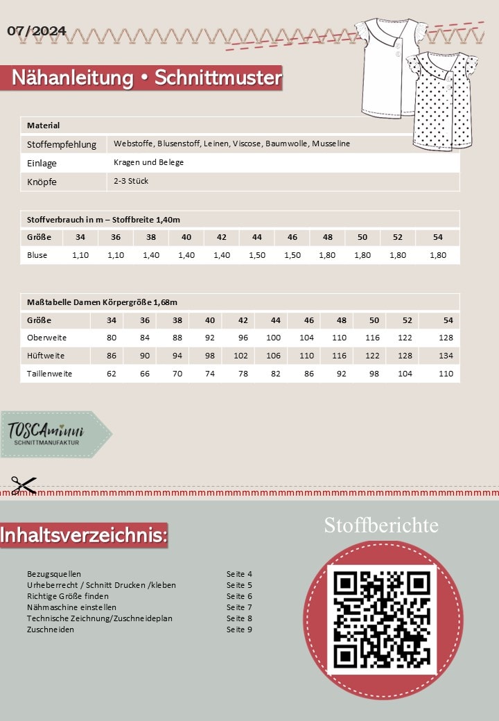 - Stoffempfehlung: Webware, wie Baumwolle, leichtes Leinen, Viskose, Musselin, Seide u.a. Grammatur 120-150g ist ideal