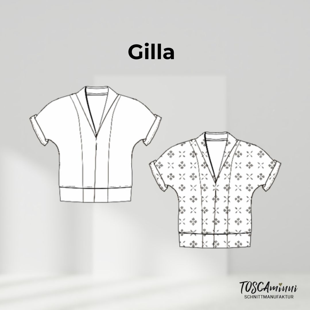 Mit dem Blusenschnittmuster Gilla nähst du eine stilvolle Bluse im Retro-Design. Der markante Umschlagkragen und die umkrempelbaren Ärmel verleihen dem Modell eine sportlich-feminine Note und erinnern an die Mode der 60er Jahre. Die locker geschnittene Bluse wird aus Webware genäht und kommt ohne Knöpfe aus – perfekt für einen entspannten Look.