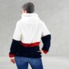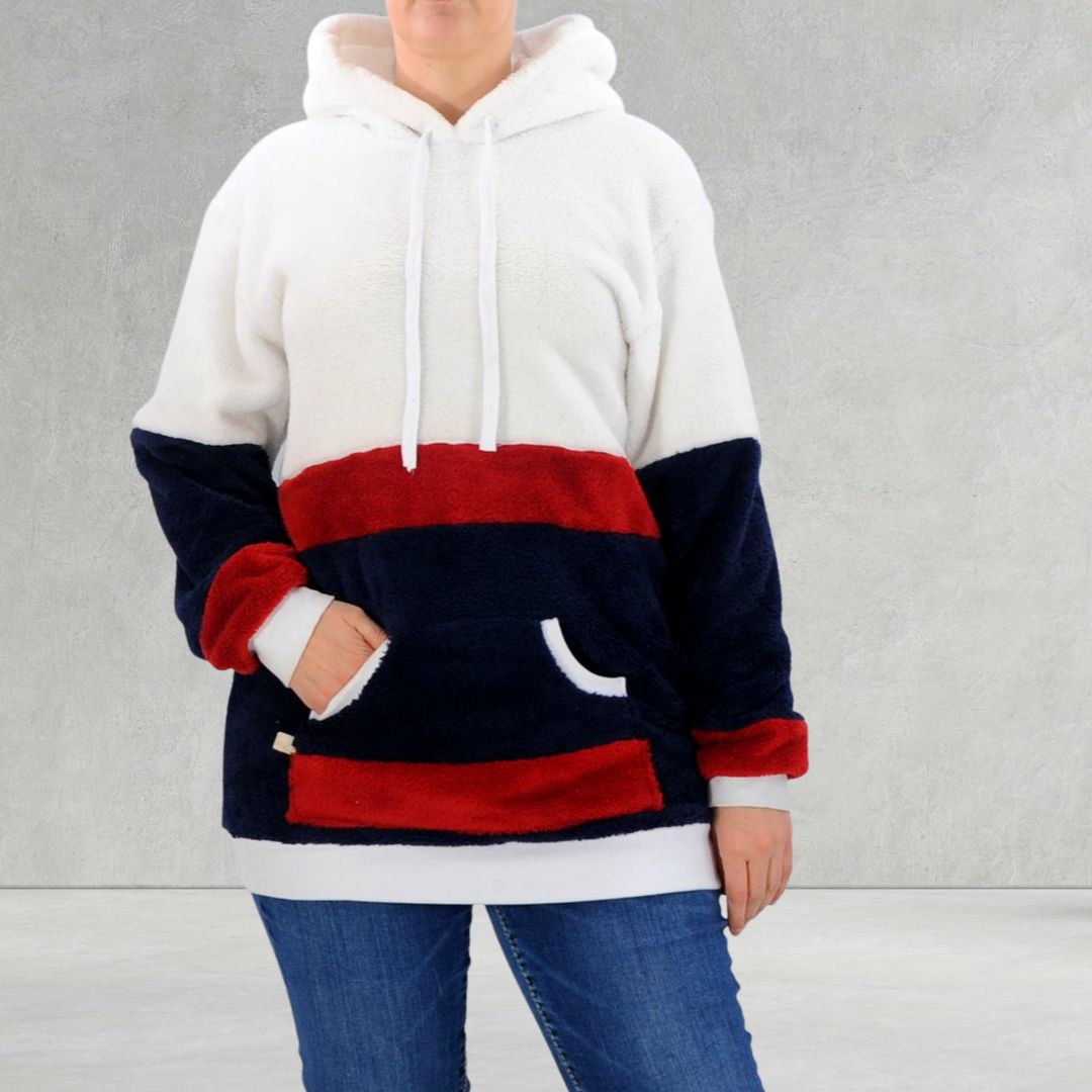 Den Hoodie kannst Du mit einer witzigen Kängurutasche nähen in der viele wichtige Platz haben wie, Tempotaschentücher, Bonbons, Handy, Schlüssel oder Hundeleckerlies – passt alles zusammen locker rein – oder alternativ mit seitlichen Einsätzen, die zum Stoff-Mix einladen und Aufsatztaschen. Ebenso steht Dir ein Vorderteil mit runden Taschen zur Verfügung und eine Color-Blocking-Variante. Wir haben bei unserem Designbeispiel nochmals extra rote Streifen aus Fleece zur Akzentierung dazischen gesetzt – auch Paspeln sehen immer gut aus.