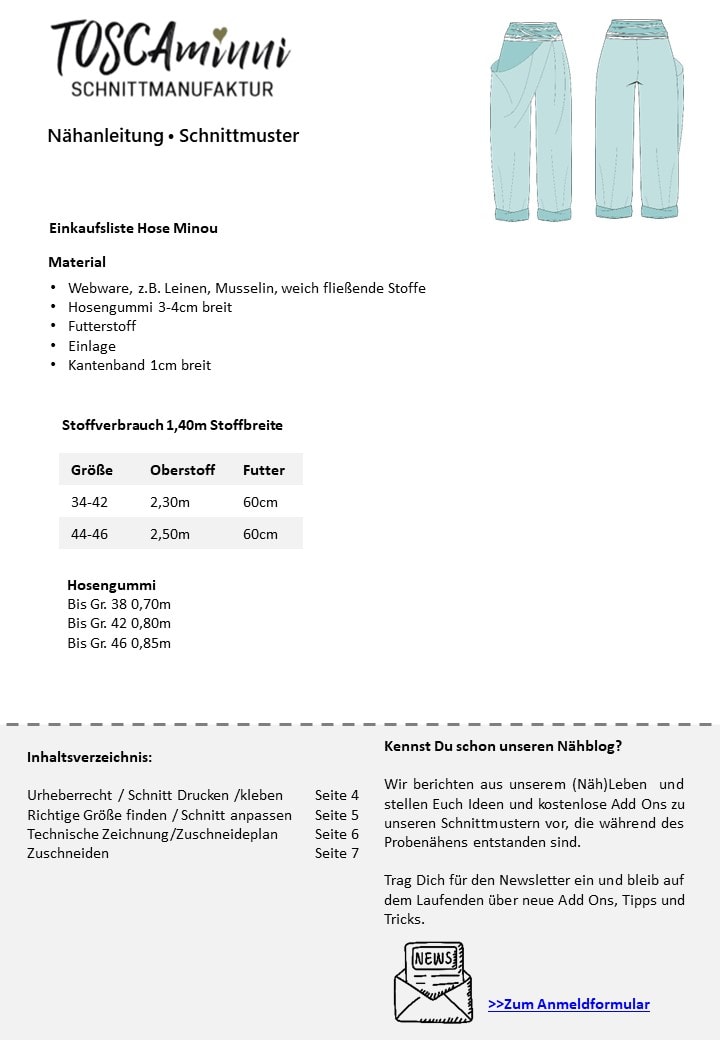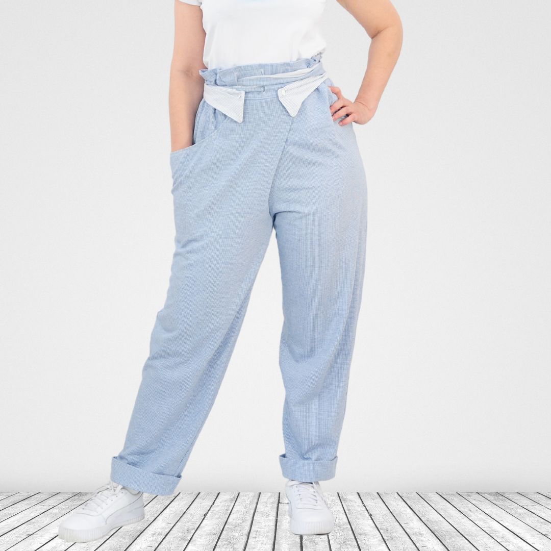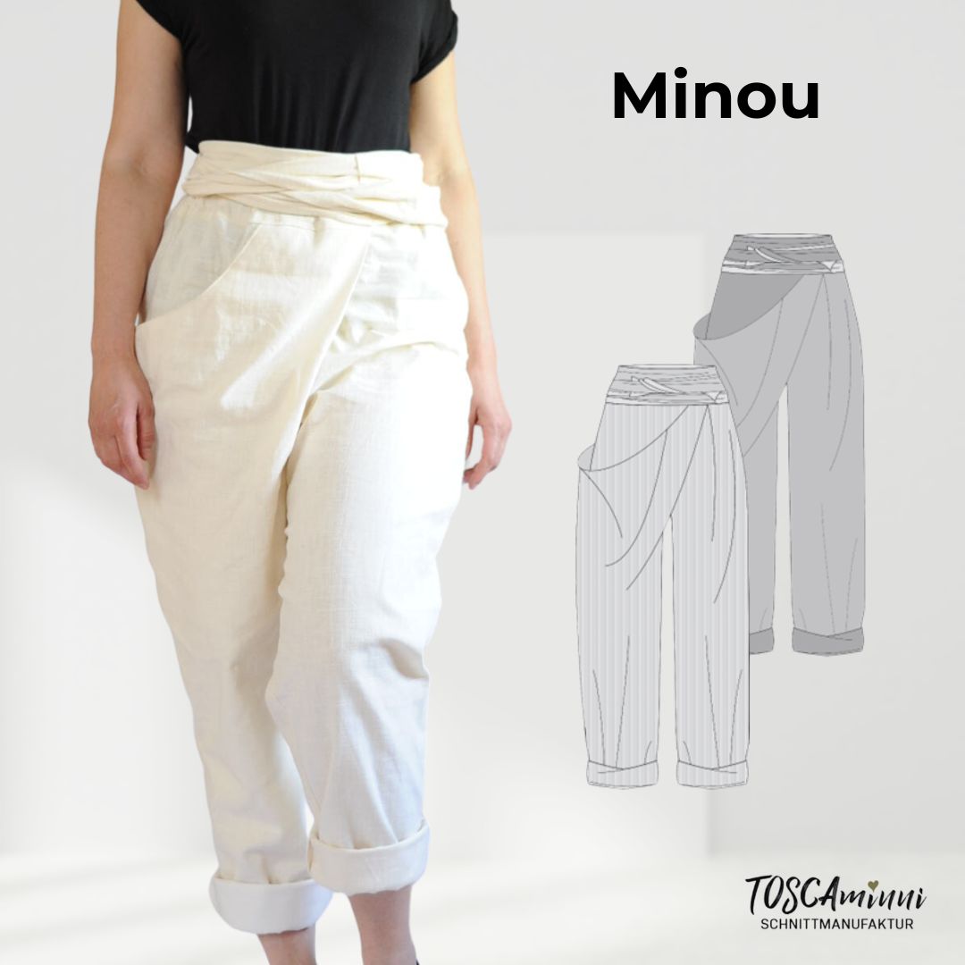 Entdecke jetzt das Schnittmuster Minou – die perfekte Sommerhose mit einer lässigen Wickeloptik! Der extra hohe Bund verleiht der Hose eine elegante Note im Paperbag-Stil und sorgt gleichzeitig für einen angenehmen Sitz. Du kannst die Hosenbeine ganz einfach umkrempeln, um eine trendige 7/8-Optik zu erzeugen. Dadurch passt die Hose sowohl zu Turnschuhen  als auch zu schicken Sandaletten oder Pumps.