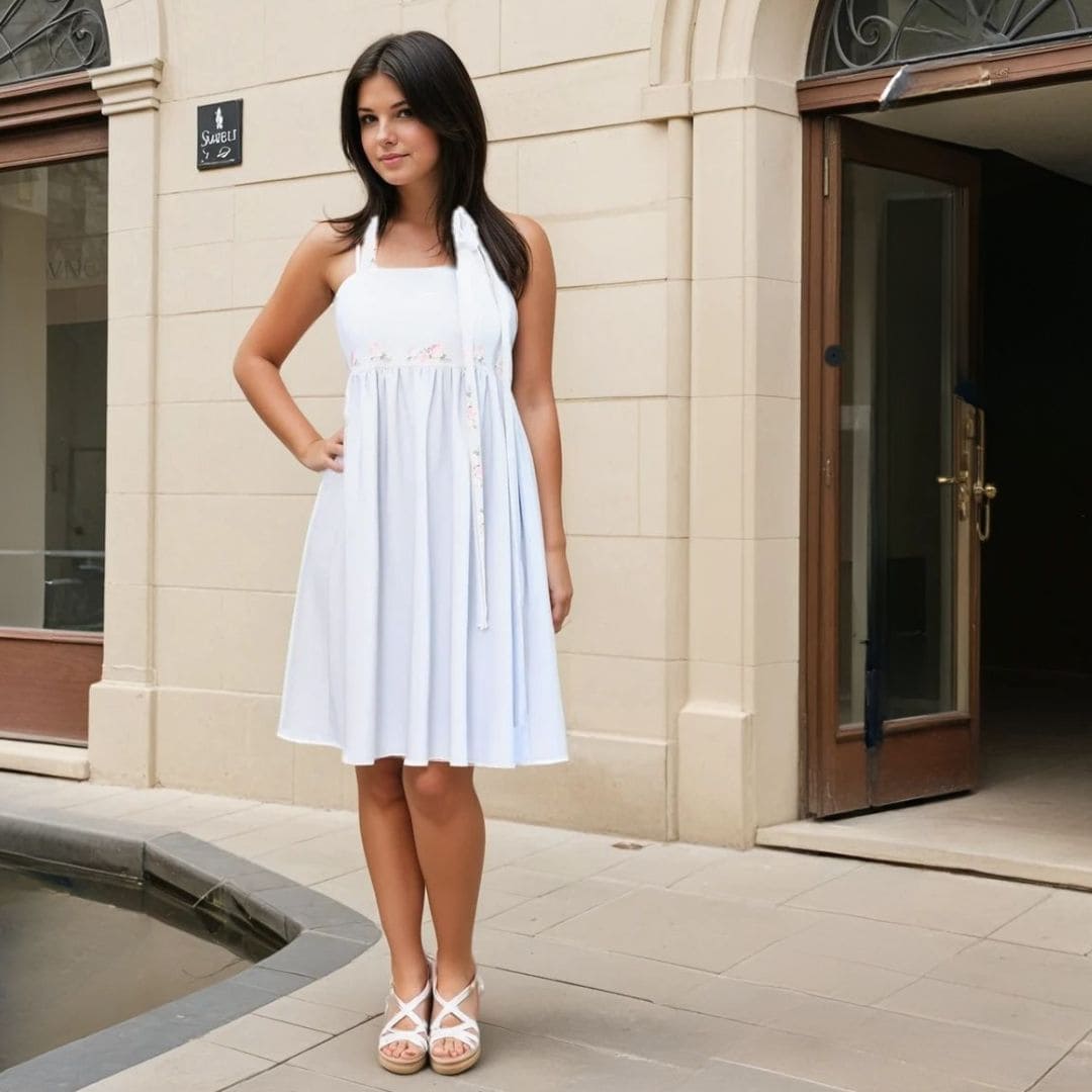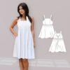 Mit diesem Schnittmuster zauberst du ein verspieltes Sommerkleid, das sich vielseitig anpassen lässt – ob als Trägerkleid mit Schwung oder als luftige Tunika über Leggings. Du hast die Wahl: Nähe klassische Träger oder binde sie als Neckholder-Variante im Nacken zusammen.