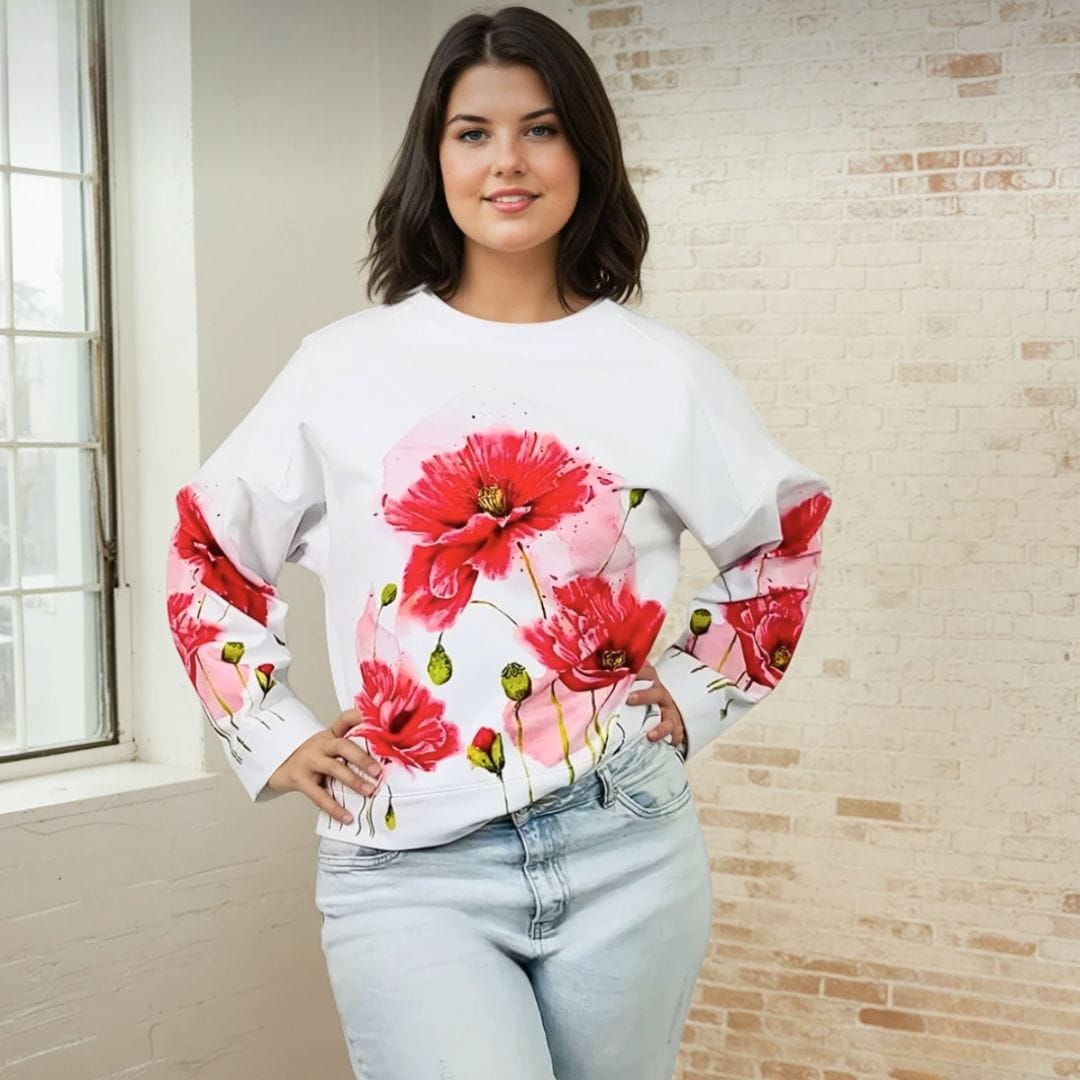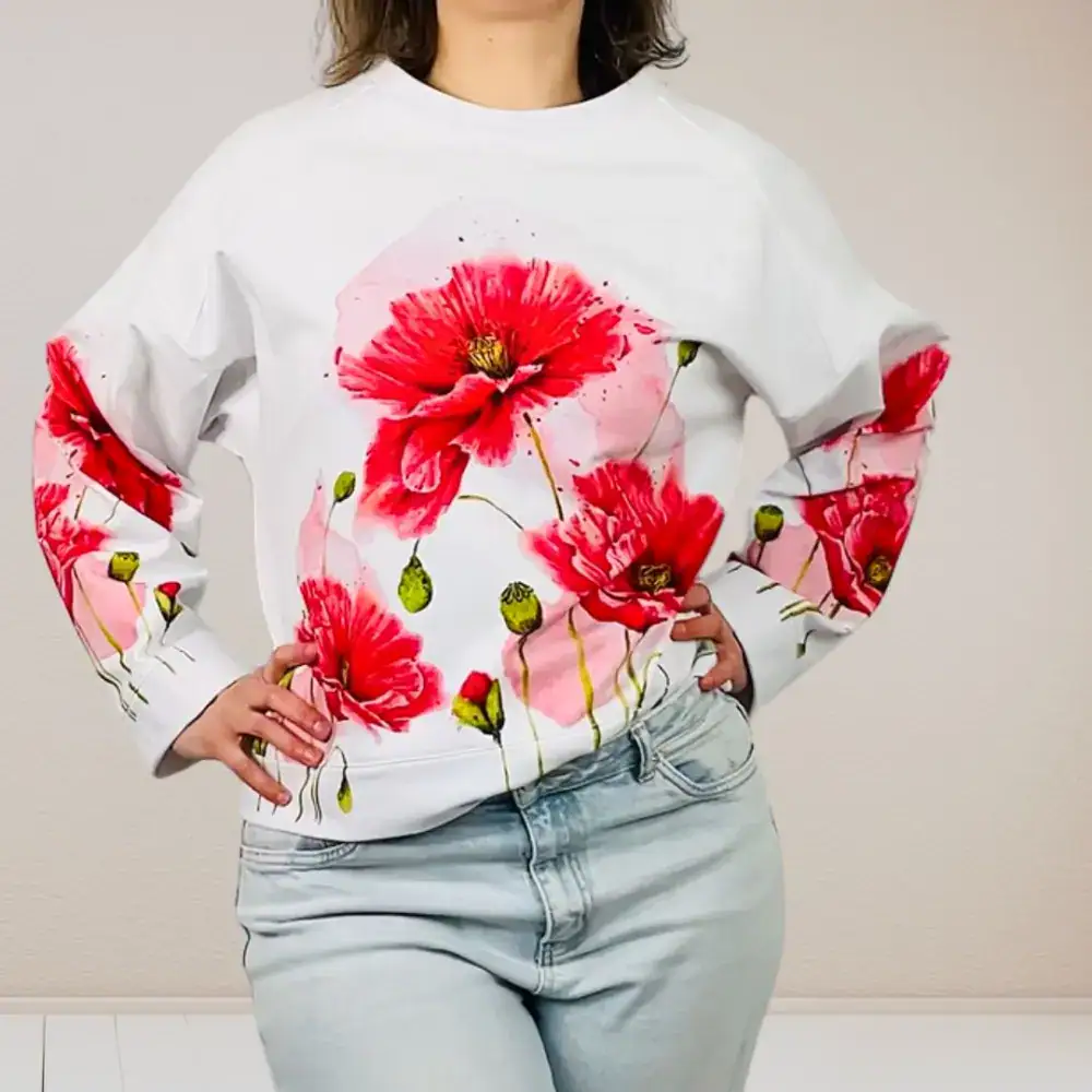 Mit dem Schnittmuster Raglanshirt INGRA zauberst du dir im Handumdrehen ein lässiges und bequemes Basic-Teil für deine Garderobe. Der Sweater ist oversize geschnitten und kommt besonders gut aus schwerem Sweatstoff zur Geltung – ideal für kühle Frühlingstage, gemütliche Abende oder einen sportlichen Look im Alltag. Durch den exklusiven Mohnblumenprint bekommt dein Raglanshirt eine elegante Note ✨.