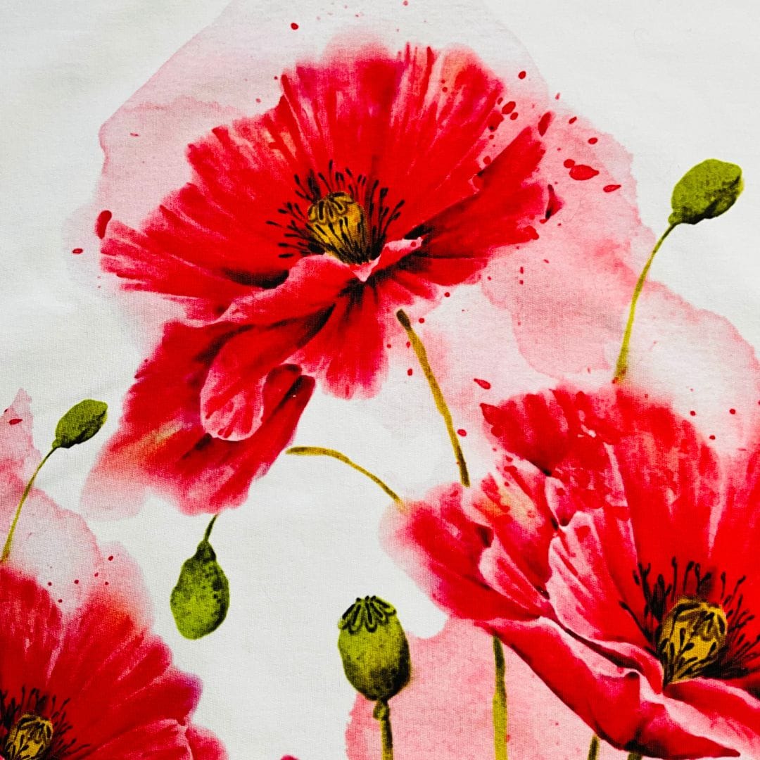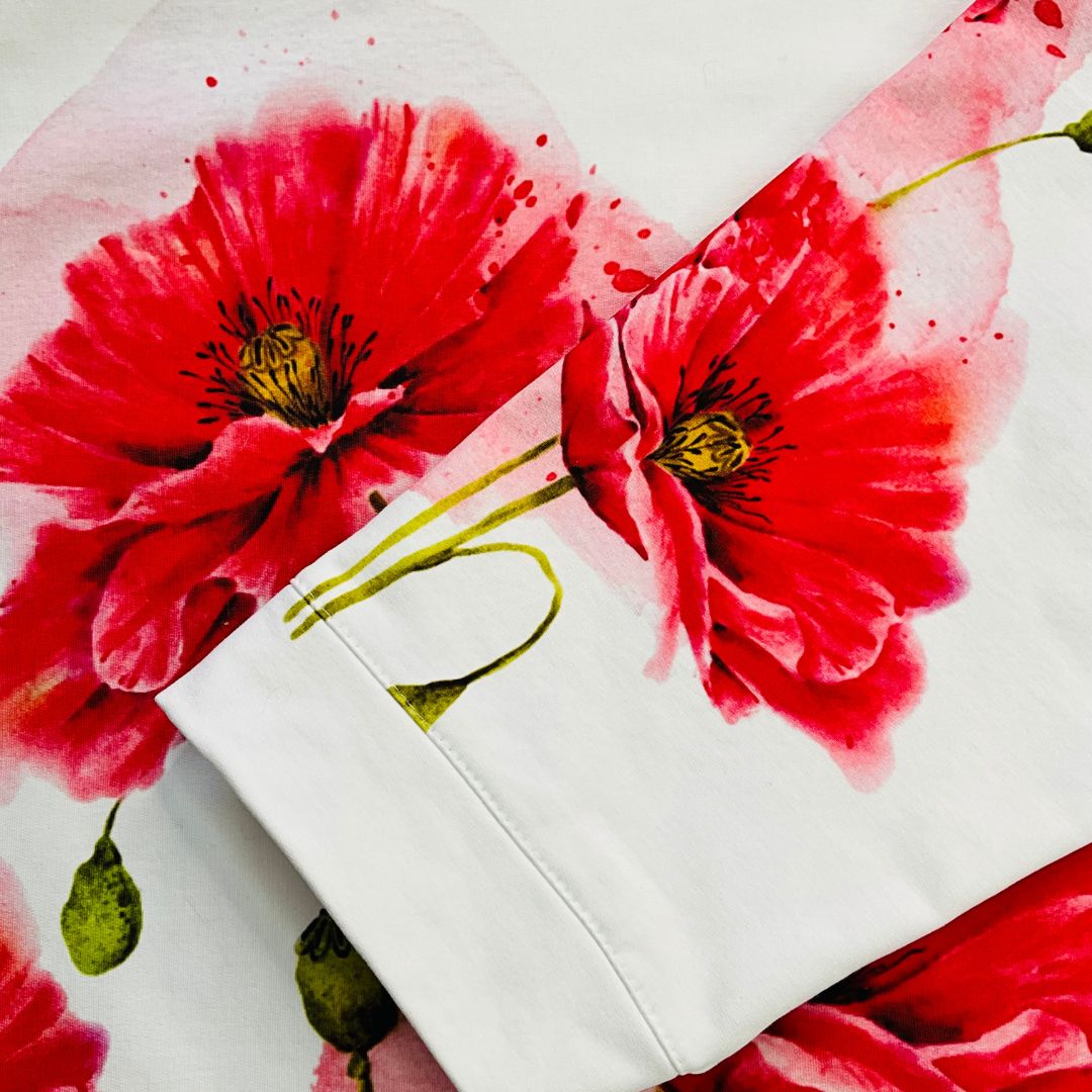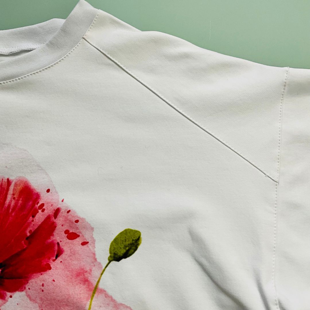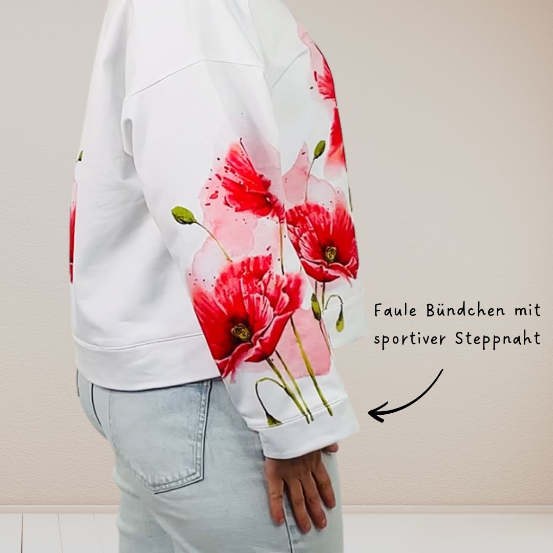 Am besten eignen sich schwere Sweatstoffe mit mind. 330g – 380g, Fleece oder Alpenfleece. Für eine sportliche Variante kannst du unifarbene Stoffe wählen, für einen besonderen Look den digitalen Mohnblumen-Print. Von leichten Stoffen raten wir ab, da das Shirt Oversize geschnitten ist und sackartig wirken würde.