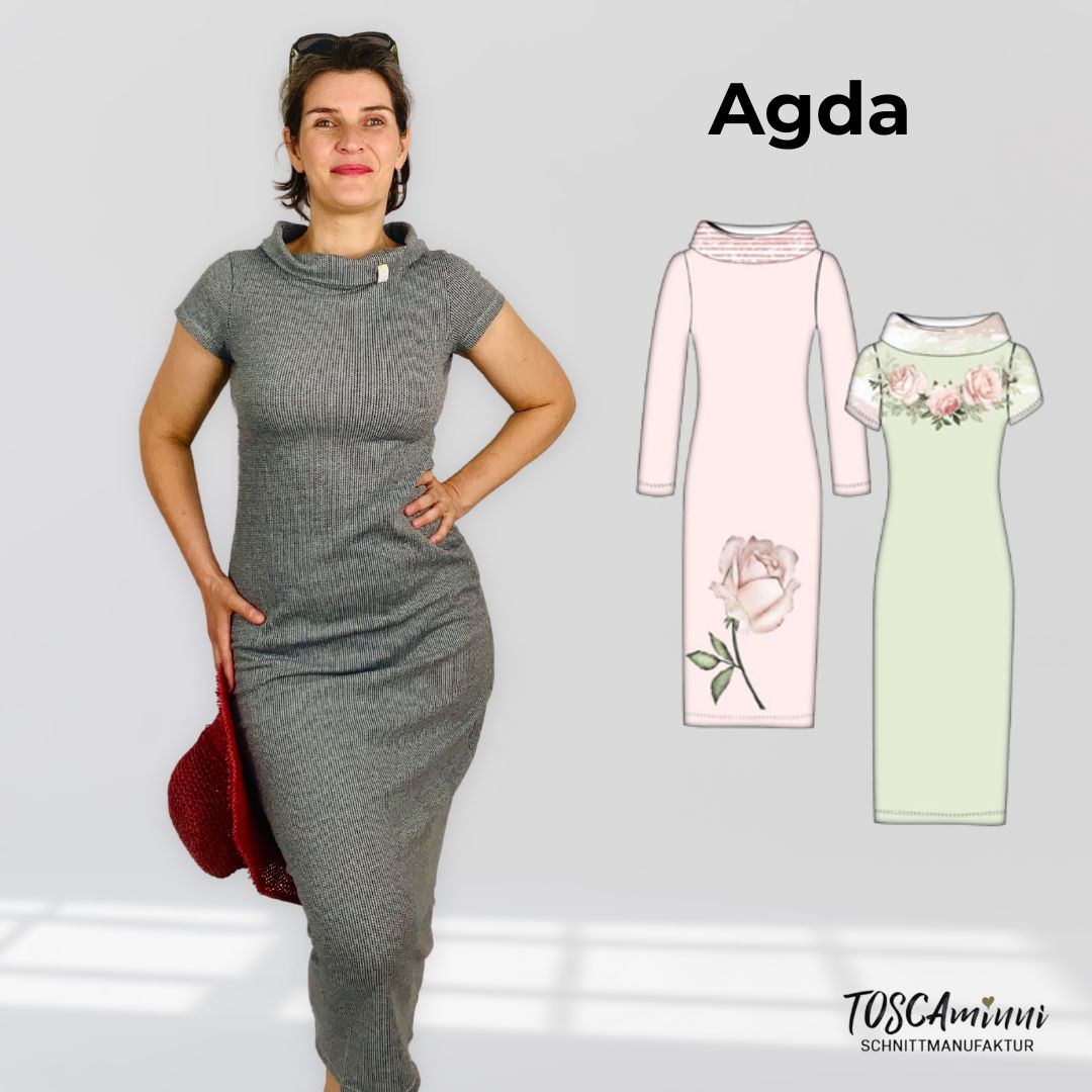 Das Schnittmuster Agda ist ein bodenlanges Jerseykleid mit dem Du garantiert viele Komplimente und Verehrer angeln wirst. Das Schnittmuster ist einfach gehalten und somit auch für Anfängerinnen geeignet. Der Hingucker bei diesem Schnitt ist der Kragen, der sich anmutig um den Hals schmiegt. Das Kleid wird in verschiedenen Längen angeboten und ist auch „shirt-tauglich“. Die schlichte Schnittführung lässt viel Spielraum für Stickereien und Applikationen – ebenfalls eignen sich Panelstoffe zur Verarbeitung.