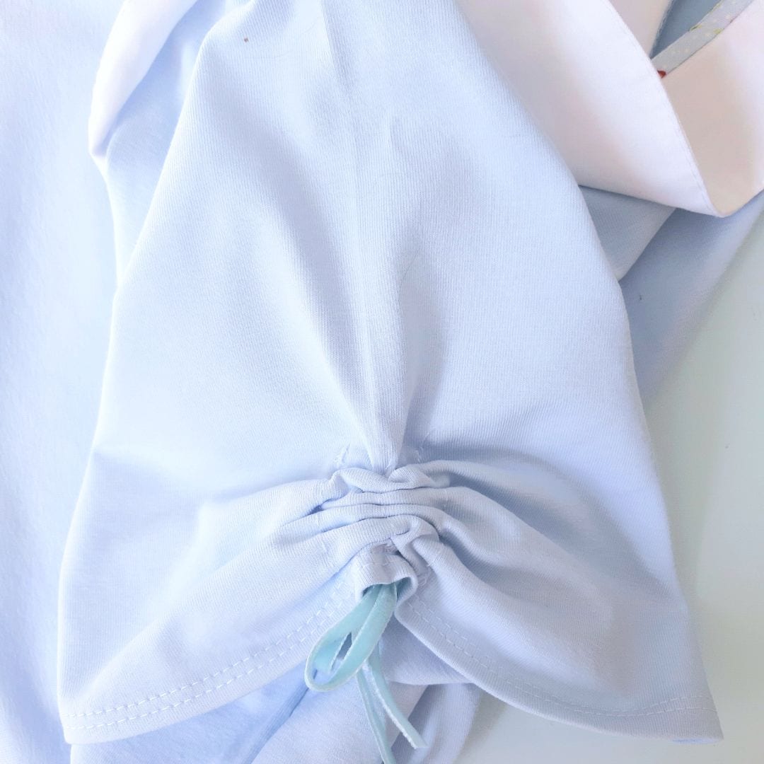 Mit dem Schnitt Danielle nähst Du Dir ein süßes Shirt bei dem als Hingucker geraffte Ärmel und ein Bubikragen verwendet wurden. Das Vorderteil kannst Du in einem Stück oder mit Passe nähen. Es stehen Dir drei Ärmelvarianten zur Verfügung: langarm – kurzarm – gerafft. Wer keinen Bubikragen möchte, näht stattdessen einfach einen Einfass-Streifen aus Jersey.