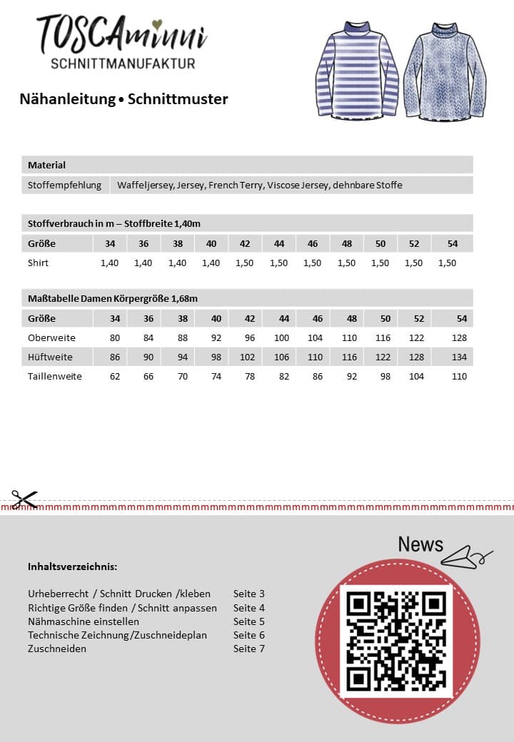- Stoffempfehlung: dehnbare Stoffe, wie Jersey, Viskose Jersey,