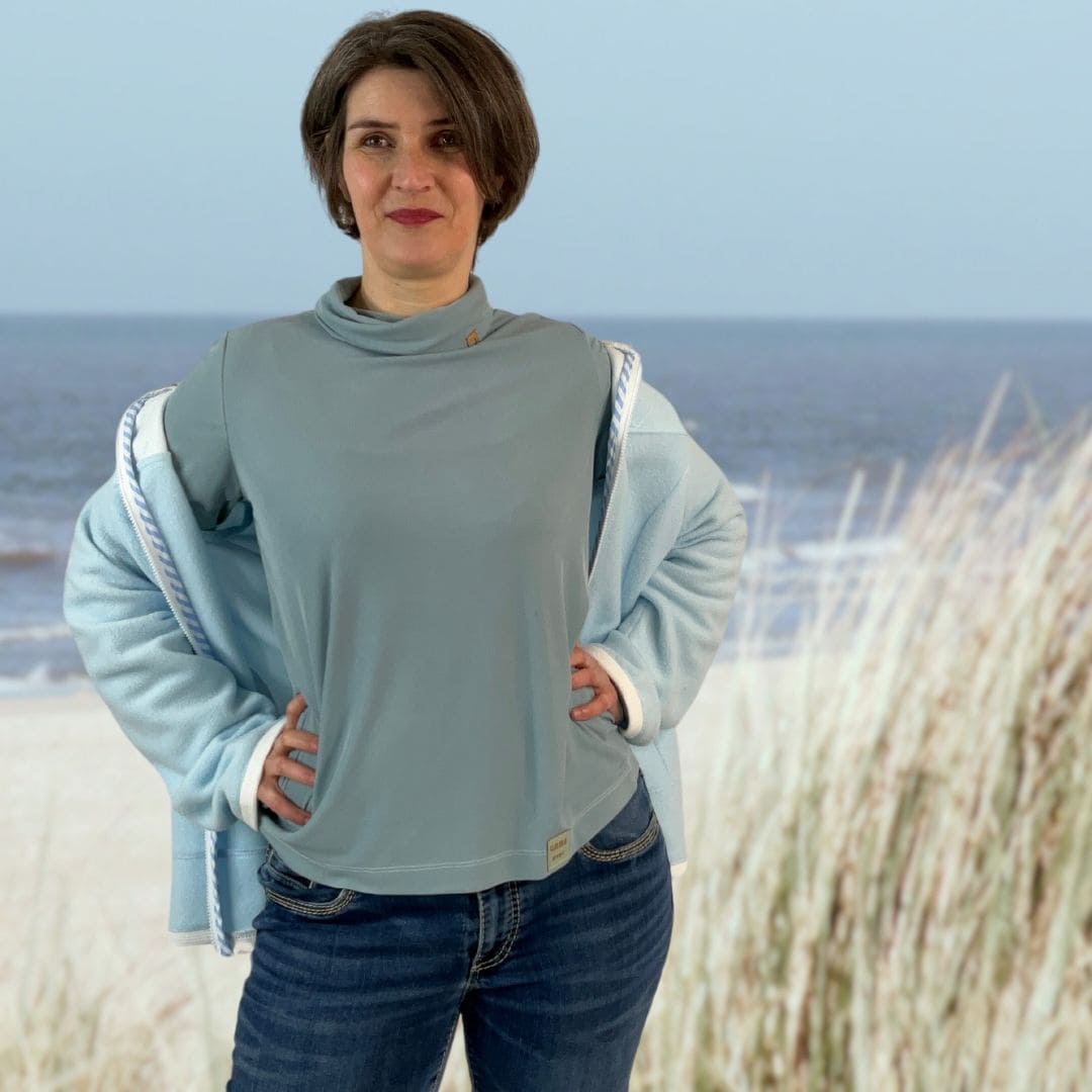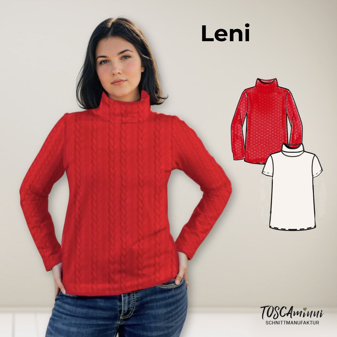 Mit dem Schnittmuster Leni hast du die Möglichkeit, ein lässiges Shirt mir Rollkragen zu nähen – perfekt für die Übergangszeit. Das Shirt ein tolles Anfängerprojekt und sehr einfach zu nähen. Trotzdem ist der Rolli wandelbar mit langen und kurzen Ärmel und wer keinen Rollkragen mag, der versäubert den Halsausschnitt einfach mit einem Bündchen.