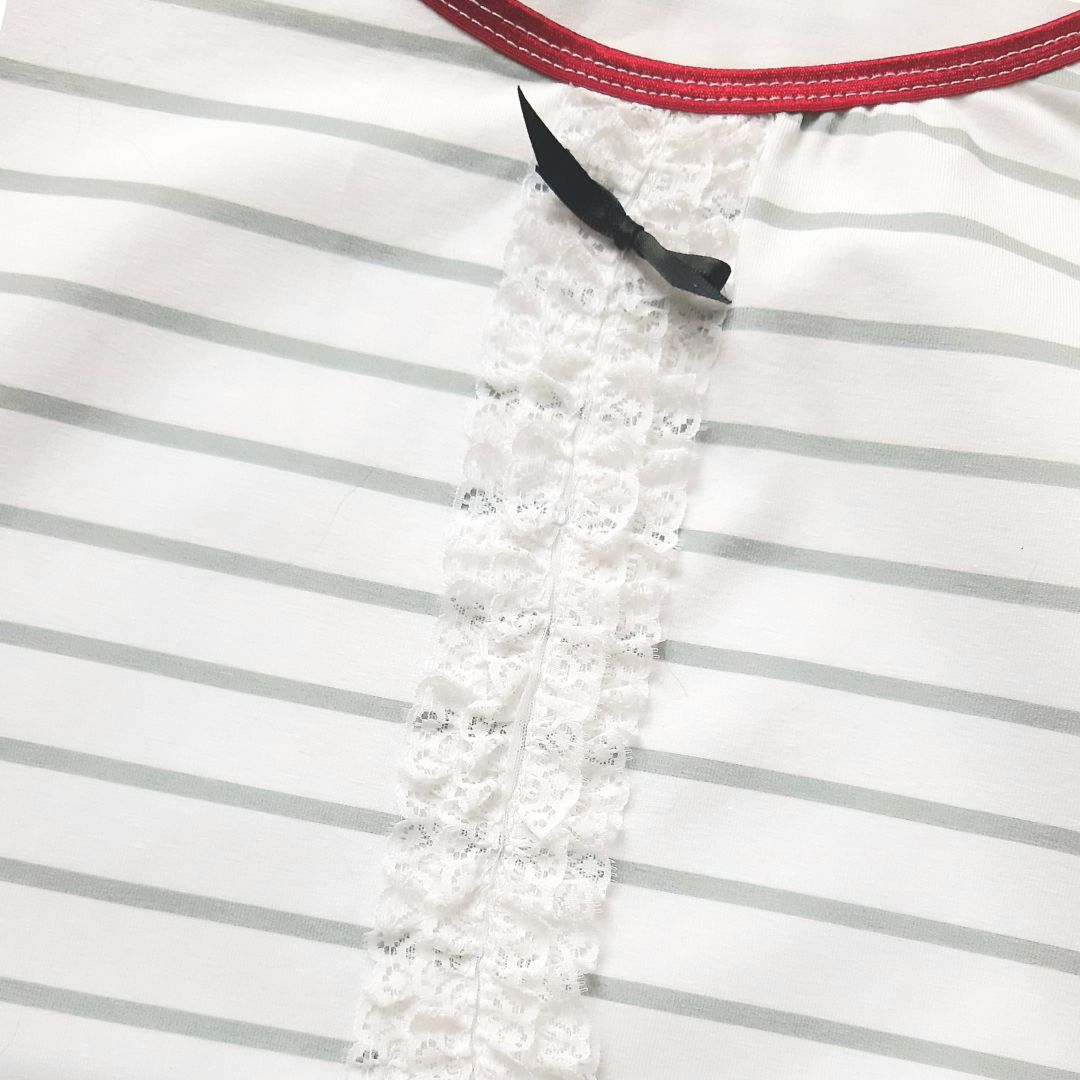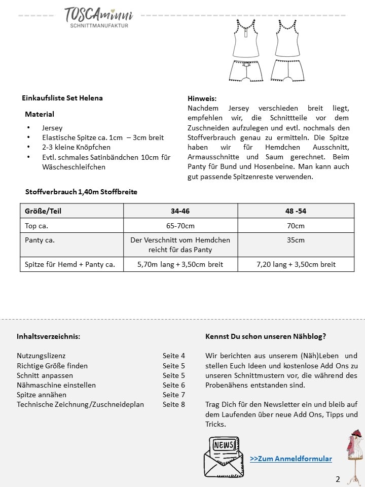 - Stoffempfehlung: Jersey, bi-elastische Stoffe, die für Unterwäsche geeignet sind + Wäschespitze / Wäschegummi