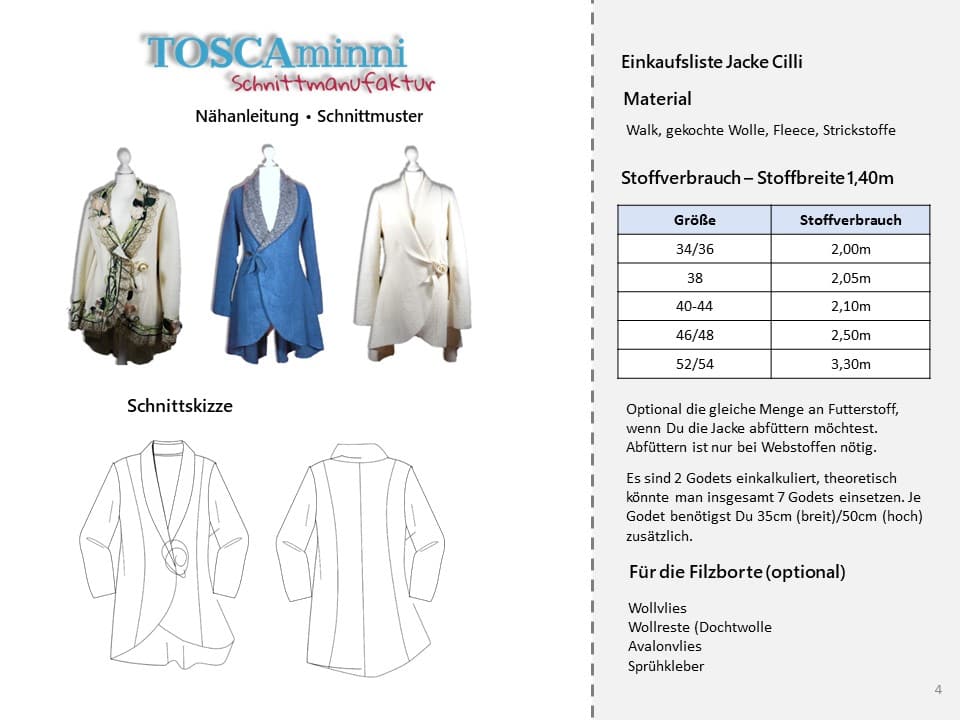 Das Schnittmuster Cilli ist eine elegante Damenjacke. Die Godets sind ein besonderes Highlight, sie verleiht der Jacke einen gewissen Vintage-Look. Gleichzeitig ist die Jacke tailliert geschnitten und wirkt daher besonders elegant.