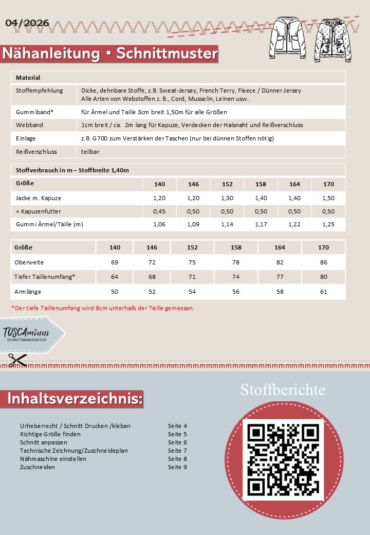 - Stoffempfehlung: Sweatjersey, Teddy, Plüsch, Webware, z.B. Cord, Musselin, Jeans u.a.