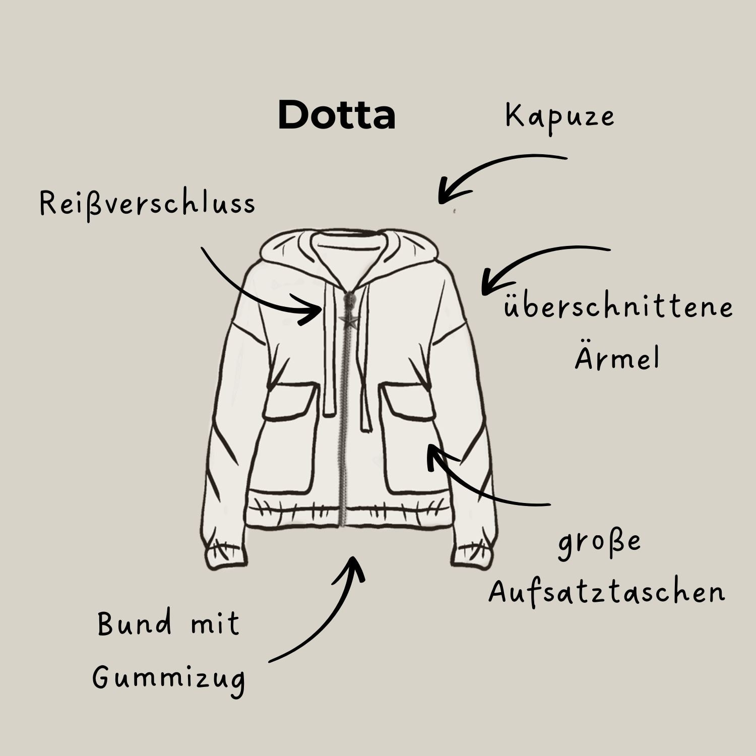 Die Jacke Dotta ist perfekt für die Übergangszeit. Die Kapuze wird abgefüttert, der Reißverschluss mit einem Webband versäubert, damit es auch innen drin schön aussieht. Ärmel- und Saumbündchen sind mit einem Gummiband gearbeitet, was der Jacke einen modernen Look verleiht.