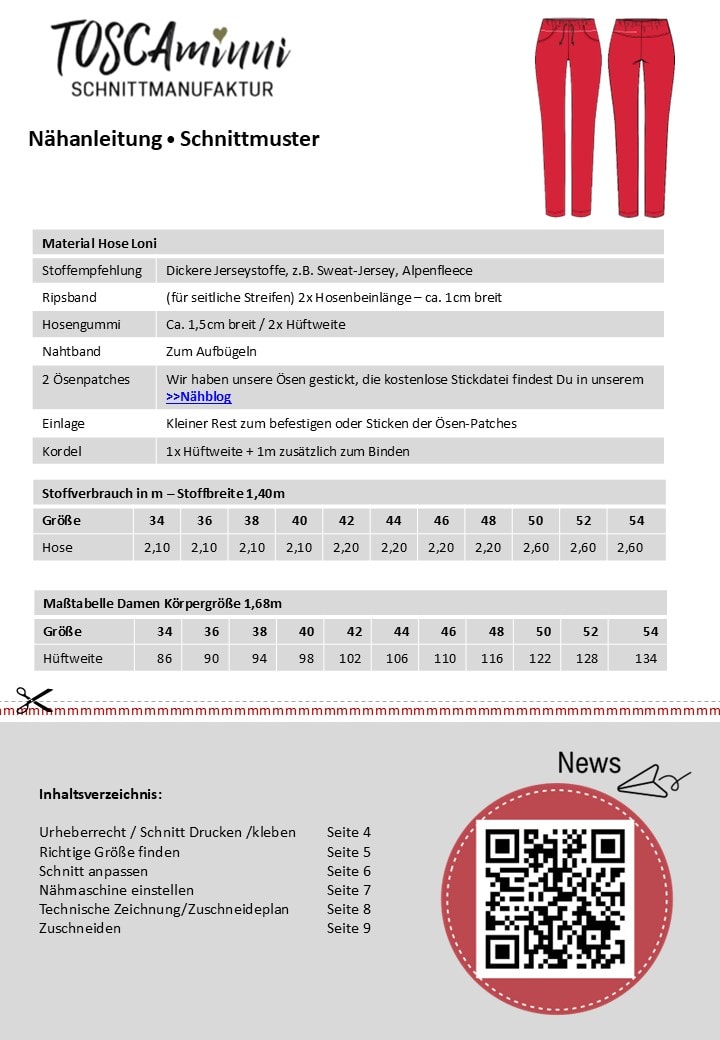 Dank der leicht verständlichen Nähanleitung mit vielen Bildern (und optionalen Videos) können sich auch Näher:innen rantrauen, die noch nicht so viel Erfahrung haben. Die Hose Loni überzeugt mit einer bequemen Passform, sportlichem Seitenstreifen und praktischem Gummibund mit Bindeband – ideal für alle Größen von 34 bis 54.