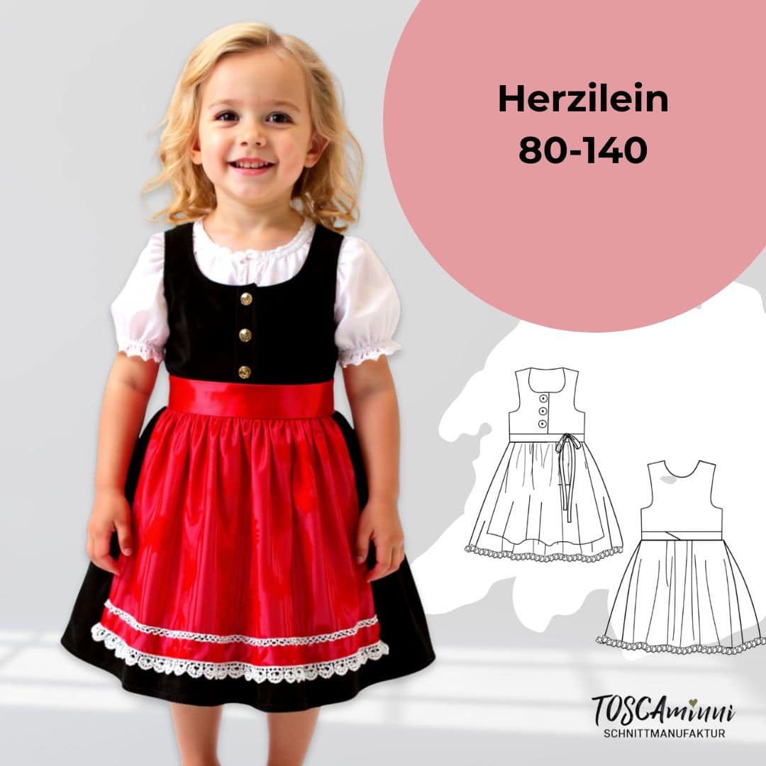 Mit dem Schnittmuster Herzliein nähst Du Dir ein bezauberndes Kinderdirndl mit Schürze. Das Dirndl kannst Du sehr gut aus Stoffresten nähen und nach Lust und Laune mit Bändern und Borten verzieren, z.B. klassisch mit „Froschgoscherln“. Das Dirndl ist einfach zu nähen, jedoch werden gute Grundkenntnisse vorausgesetzt, z.B. Knöpfe einnähen, Rock einkräuseln oder Oberteil versäubern.