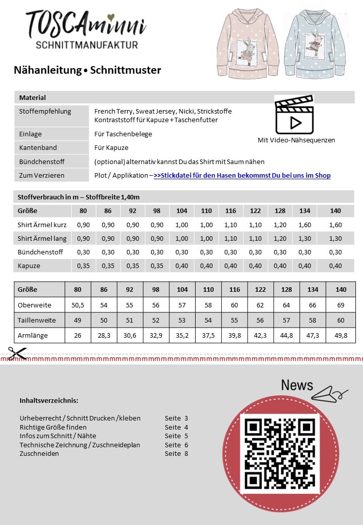 • Stoffempfehlung: Sweatstoff, Jersey, French Terry, Nicki