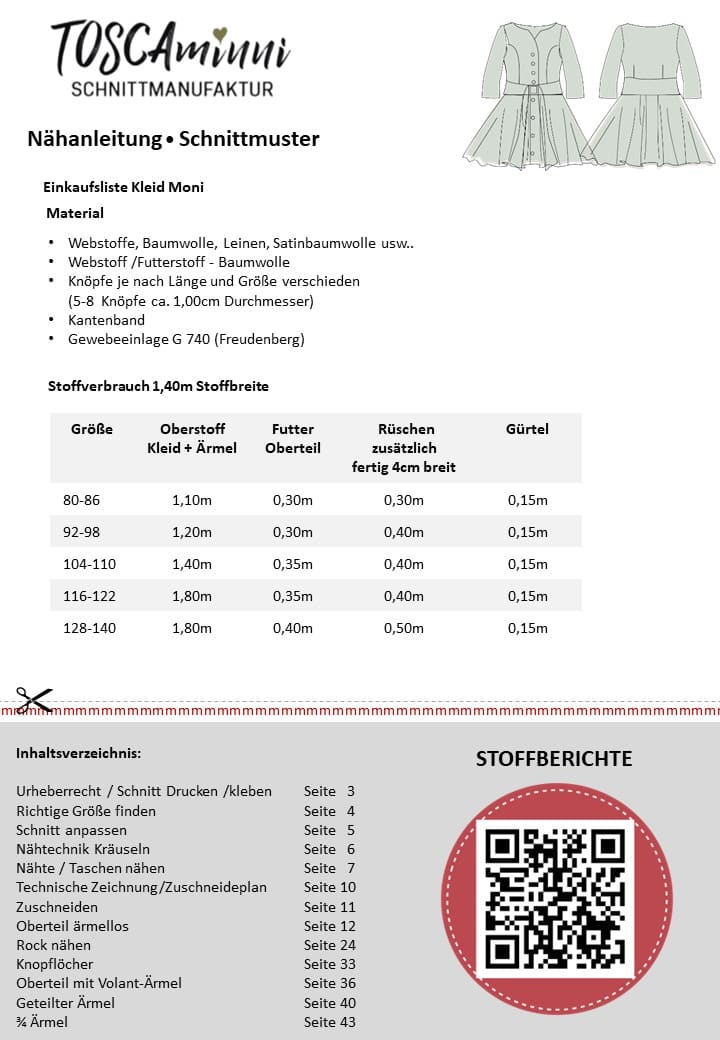 Mit dem Schnittmuster Moni „minni“ kannst du ein bezauberndes Kinderkleid mit Flügelärmel nähen. Das Kleid besteht aus einem geteilten Oberteil mit einem angesetzten Tellerrock. Es wird aus Webware genäht und hat eine durchgehende Knopfleiste an der Vorderseite. Alternativ zu Knöpfen können auch Druckknöpfe oder Kam Snaps verwendet werden.