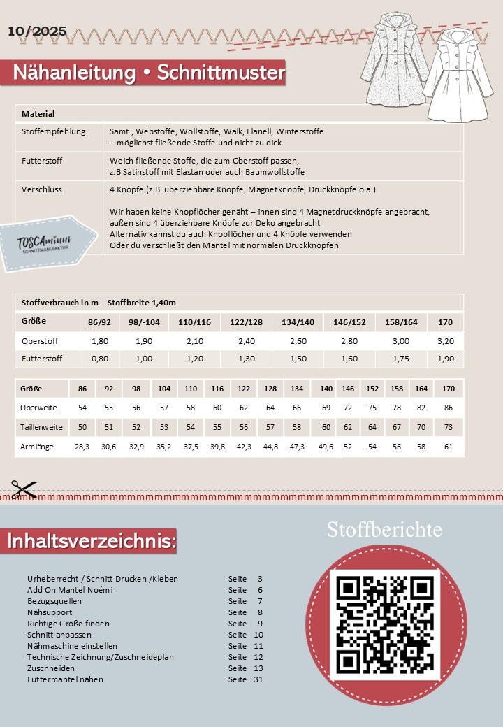 Der Kindermantel Noémi ist mehr als nur ein Schnitt – er ist ein echtes Highlight für deine Nähleidenschaft. Mit seiner romantischen Linienführung, der klaren Anleitung und dem ergänzenden Video gelingt auch weniger geübten Näher:innen ein professionelles Ergebnis. So wird Nähen zum Vergnügen – Schritt für Schritt, ganz ohne Stress.