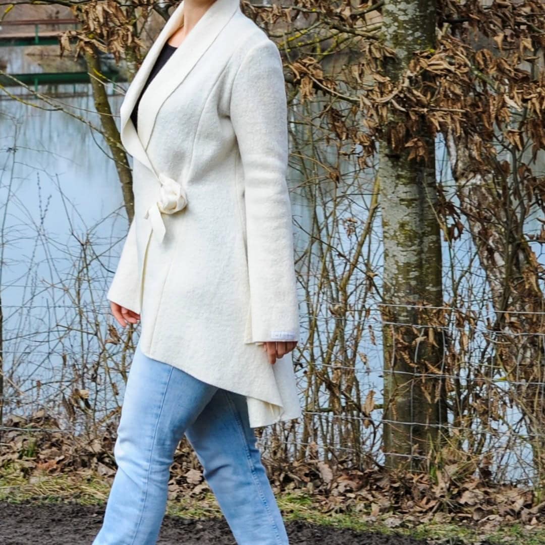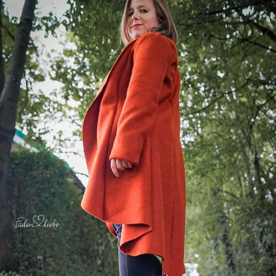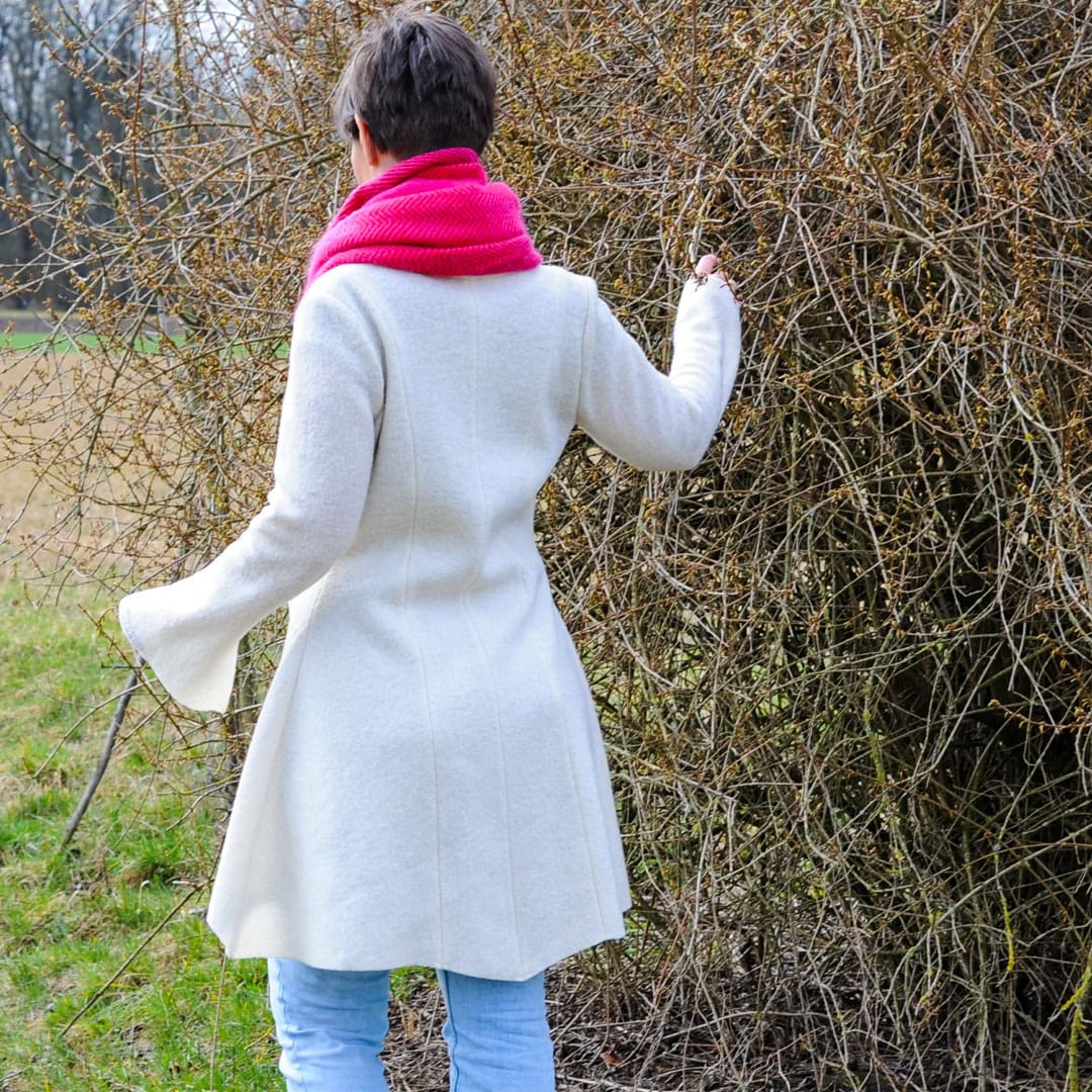 Das Schnittmuster Cilli ist eine elegante Damenjacke. Die Godets sind ein besonderes Highlight, und verleihen der Jacke einen gewissen Vintage-Look. Gleichzeitig ist sie tailliert geschnitten, zudem Vokuhila – also vorne kurz und hinten lang.