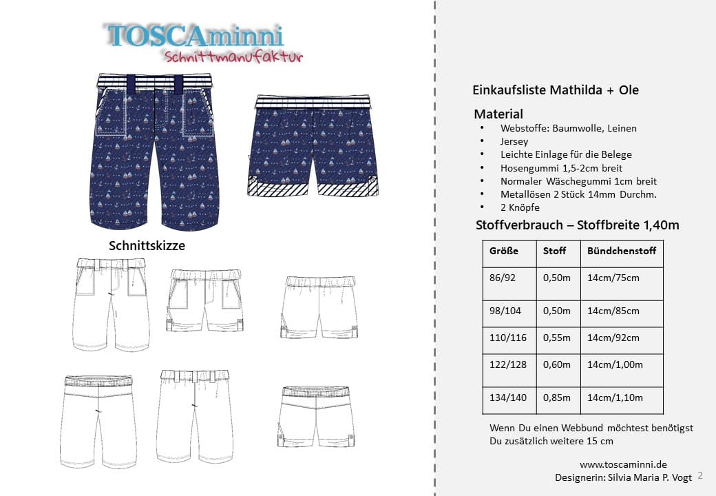 Schnittmuster kurze Hose Ole+Mathilda Gr. 80-140