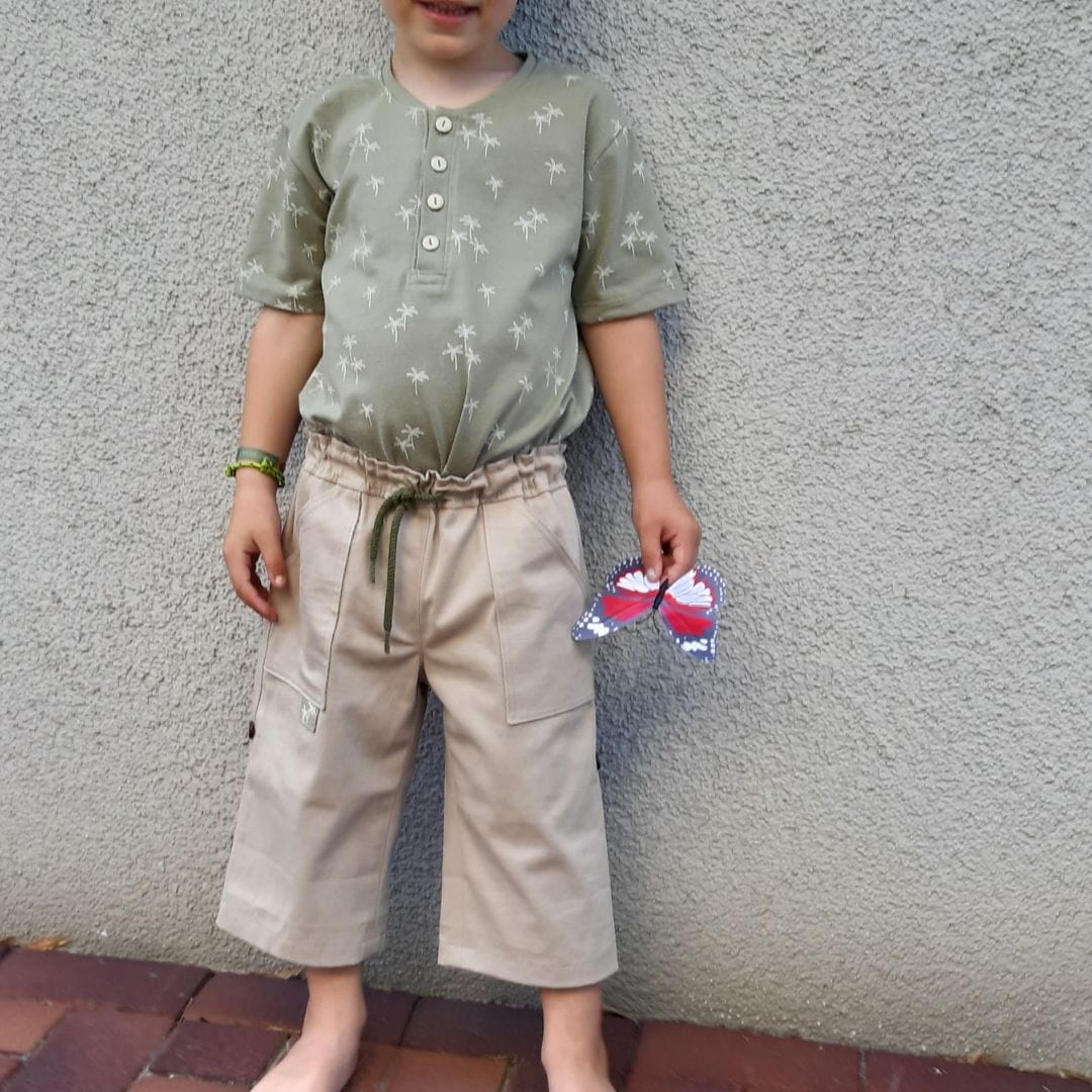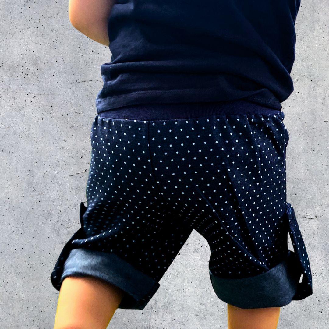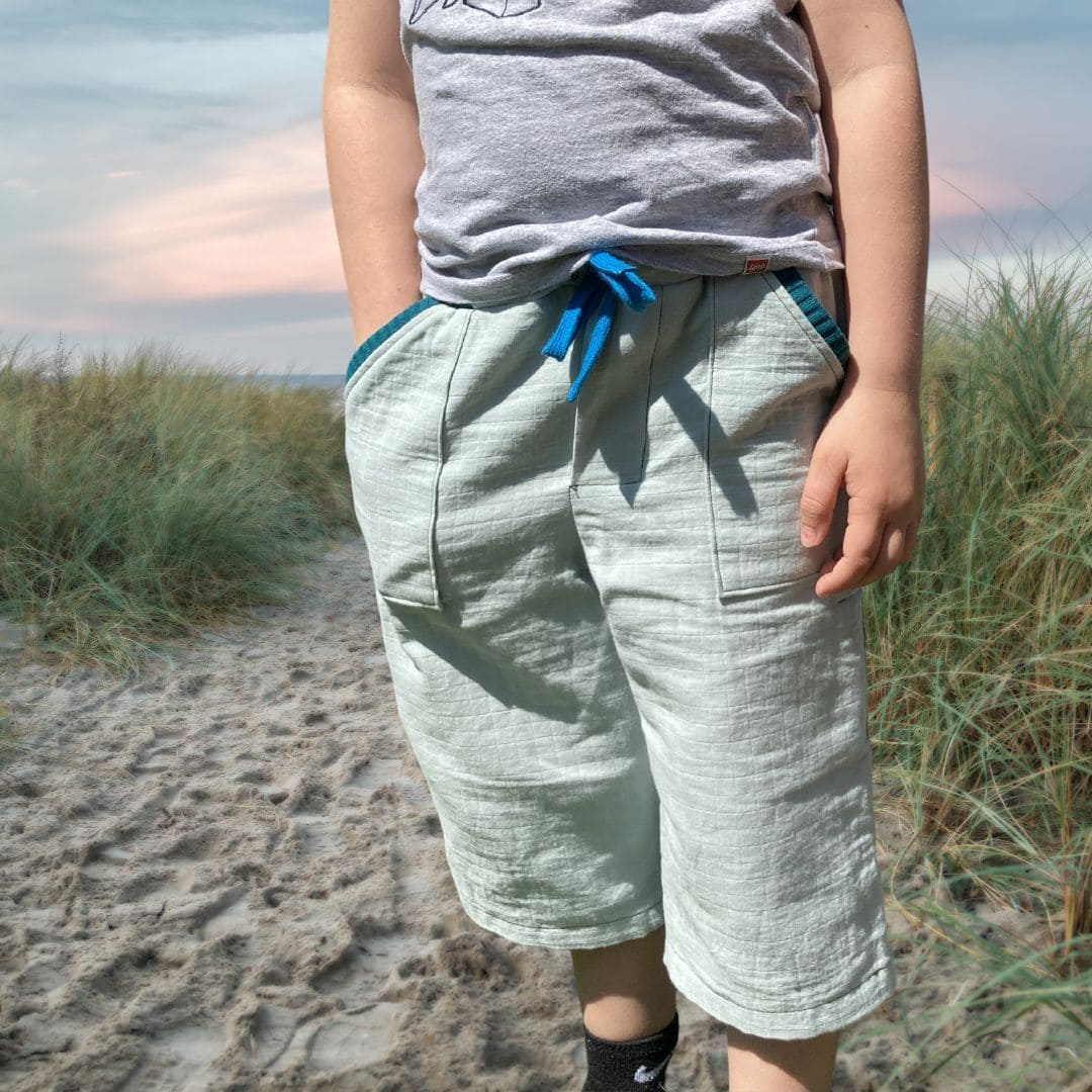 Mit dem Schnittmuster Ole + Matilda nähst Du freche Bermudashorts für den Sommer. Die Shorts enden auf Höhe der Wade und können aber auch hochgekrempelt und mit einem Riegel fixiert werden, so dass sie bereits über dem Knie enden. Die Hose kannst Du aus Jersey oder aus Webware nähen – der Schnitt / Nähanleitung bietet Dir ebenfalls verschiedene Versionen, die Hose alternativ mit Sattel zu nähen, so dass sie sportlicher wirkt oder die Beinabschlüsse / Hosenbund mit pfiffigem Bündchenstoff zuversäubern. Alternativ kann auch Webware oder Jersey verwendet werden.