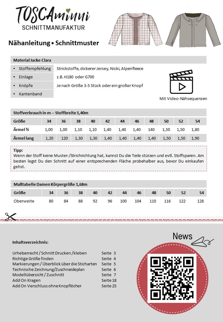 Schnittmuster Kurzjacke Clara Größe 34-54 mit Kragen