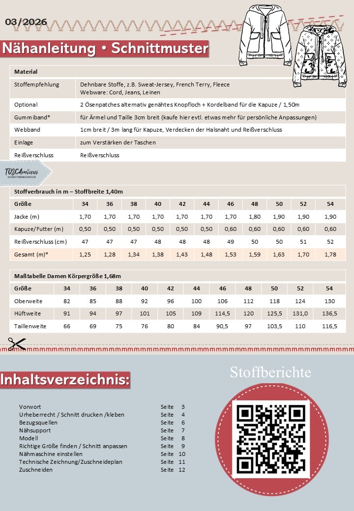 Materialempfehlung & Vielseitigkeit:vDieses Schnittmuster ist speziell für mittelschwere bis schwere Stoffe konzipiert, z.B: Heavy Sweat, dickere Webware geht aber auch. Die Jacke ist oversize geschnitten und hat genug Bewegungsfreiheit für nicht elastische Stoffe. Die Kapuze wird abgefüttert und dafür kannst du prima deine Stoffreste verwerten.