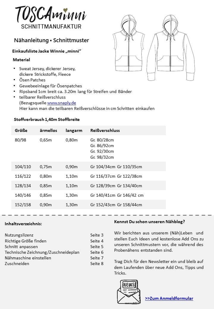 - Stoffempfehlung: dickere, Stoffe Fleece, Sweatjersey, French Terry