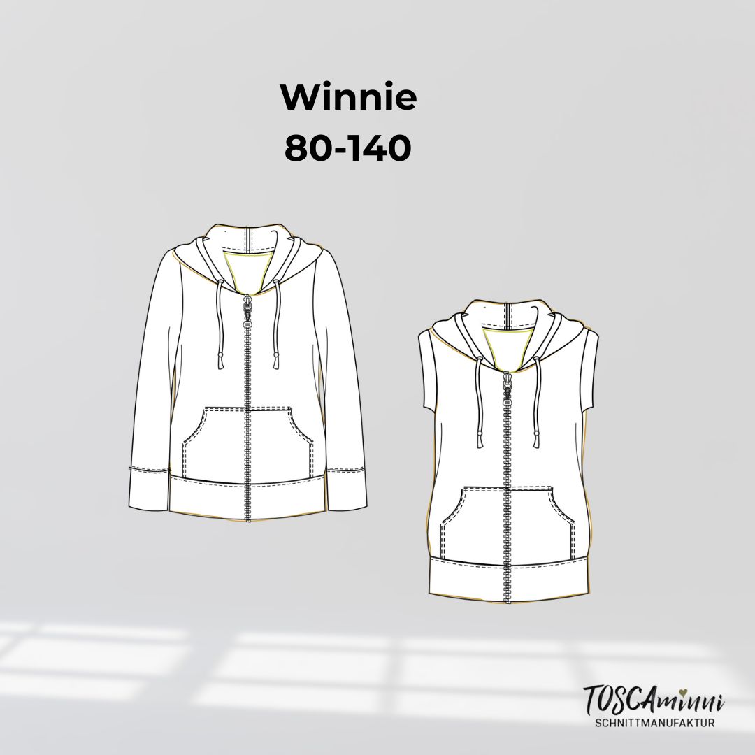 Weste oder Jacke? Mit der Jacke Winnie minni nähst Du in jedem Fall einen supercoolen Sweater mit Kapuze für Kinder. Die Jacke kannst Du als Weste oder als Jacke mit langen Ärmeln nähen.
