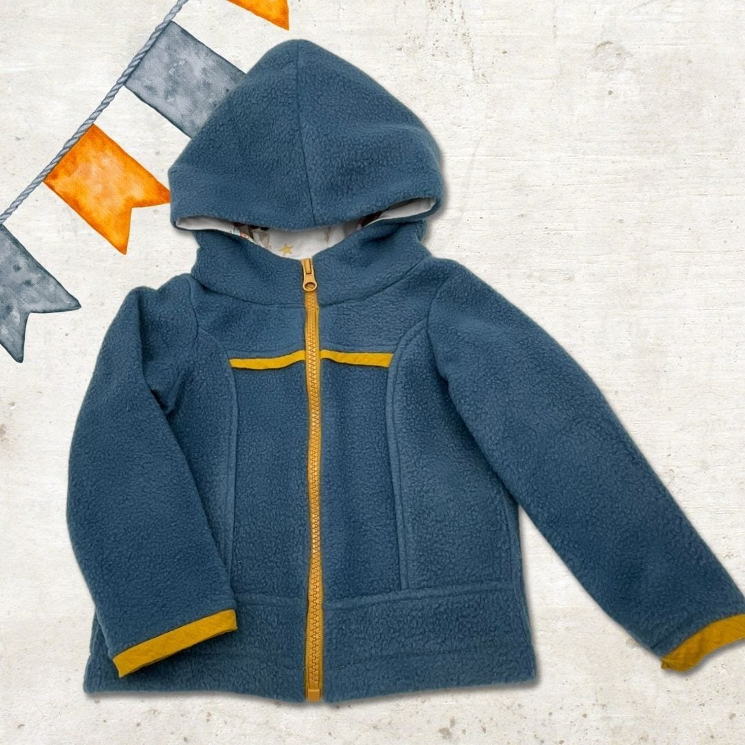 Empfohlen sind Fleece, Alpenfleece, Sweat, Strickstoffe – Stoffe, die etwas dicker und etwas elastisch sind. Für die Kapuze lassen sich auch kontrastreiche Stoffe wie Musselin einsetzen. Von Softshell raten wir ab.