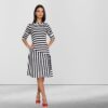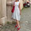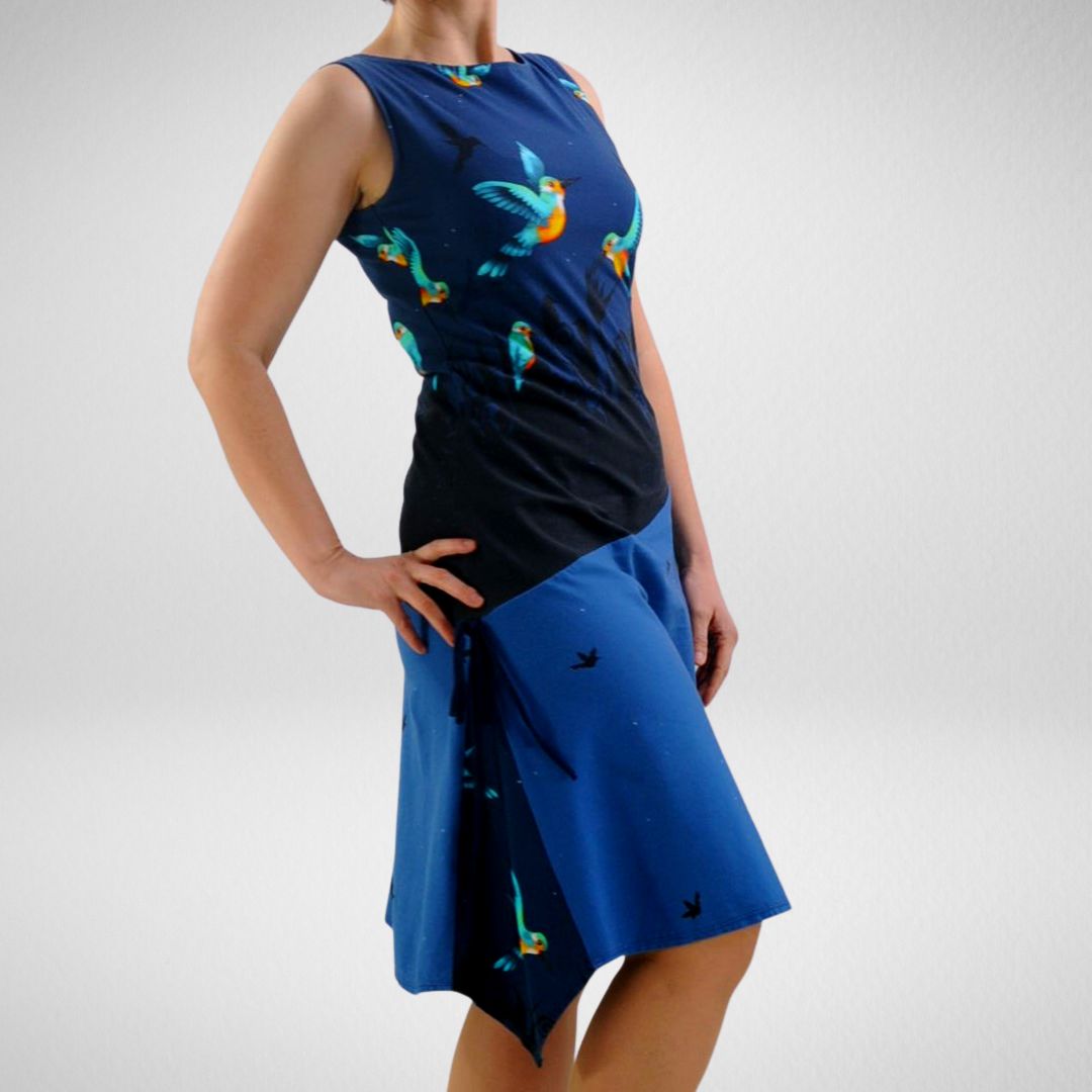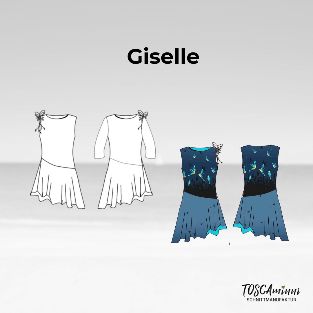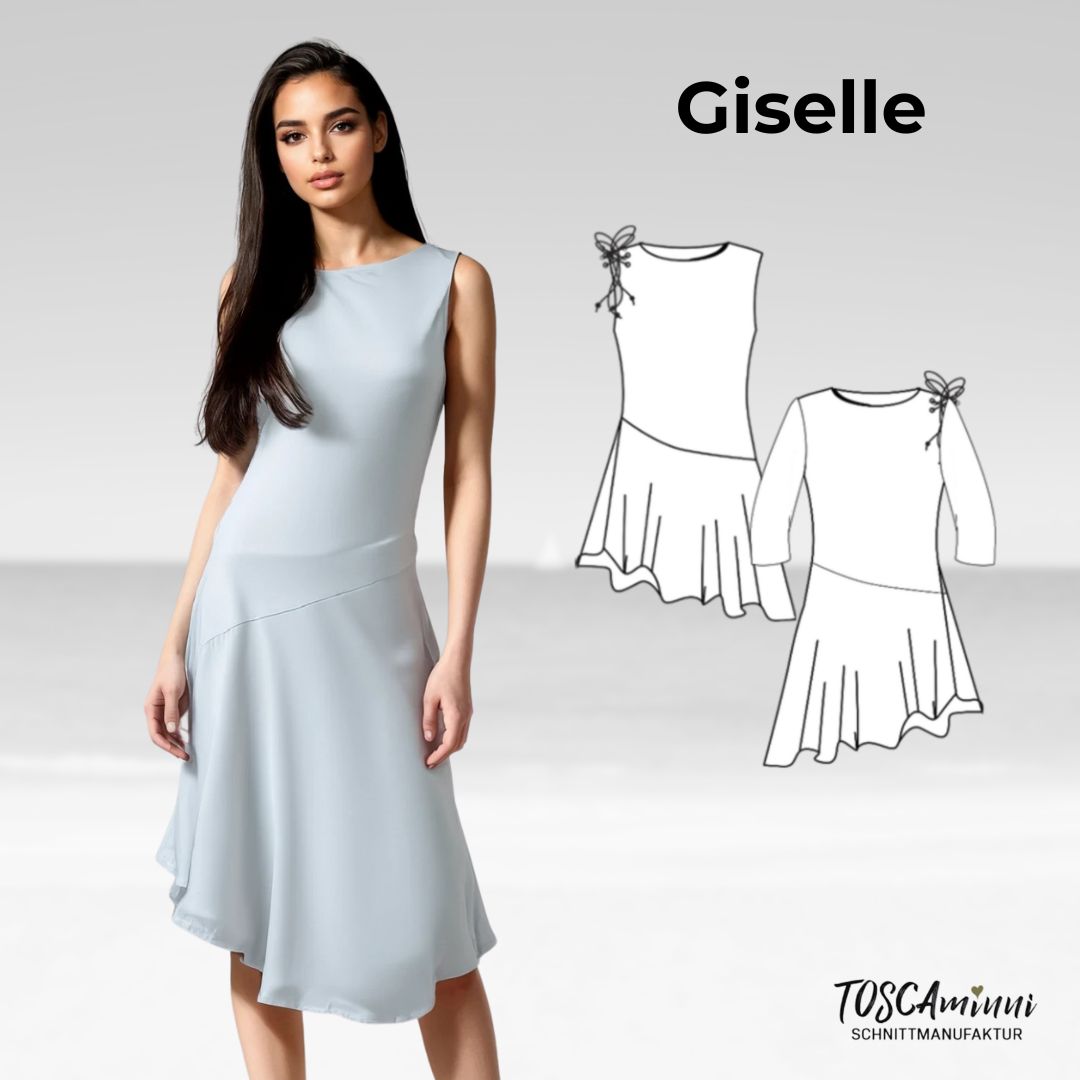 Das Schnittmuster Giselle ist ein schlichtes Jerseykleid für Damen im 20er Jahre-Stil. Im Rockteil ist eine Godet-Falte eingearbeitet. Das Oberteil ist asymmetrisch und sehr schlicht gehalten, dadurch verlängert sich optisch der Oberkörper. Ein gute Möglichkeit ist, das Kleid mit „Jersey-Nudeln“ zu akzentuieren. In der schwarz-weissen Variante haben wir eine rote Paspel mit eingearbeitet. Das Kleid kann auch mit Ärmel genäht werden, so dass es auch im Herbst/Winter getragen werden kann.